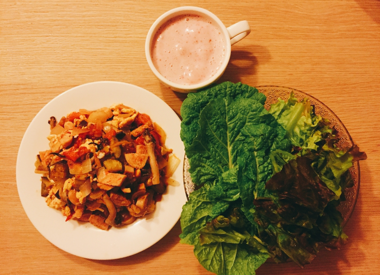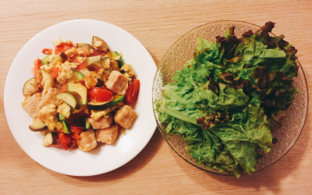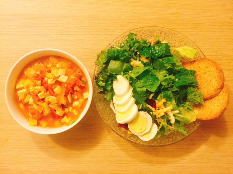 #양파반개+방울토마토 열몇개+호박 1/5+두부반모를 넣어 탄생한 토마토스튜! 인데 두부가 들어있어..... 거기에 오늘 안먹으면 상해버릴 샐러드까지! 고단백 식단인데.....?;;;