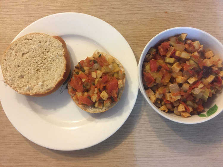 저녁- 통밀빵과 토마토야채닭가슴살소시지볶음..?