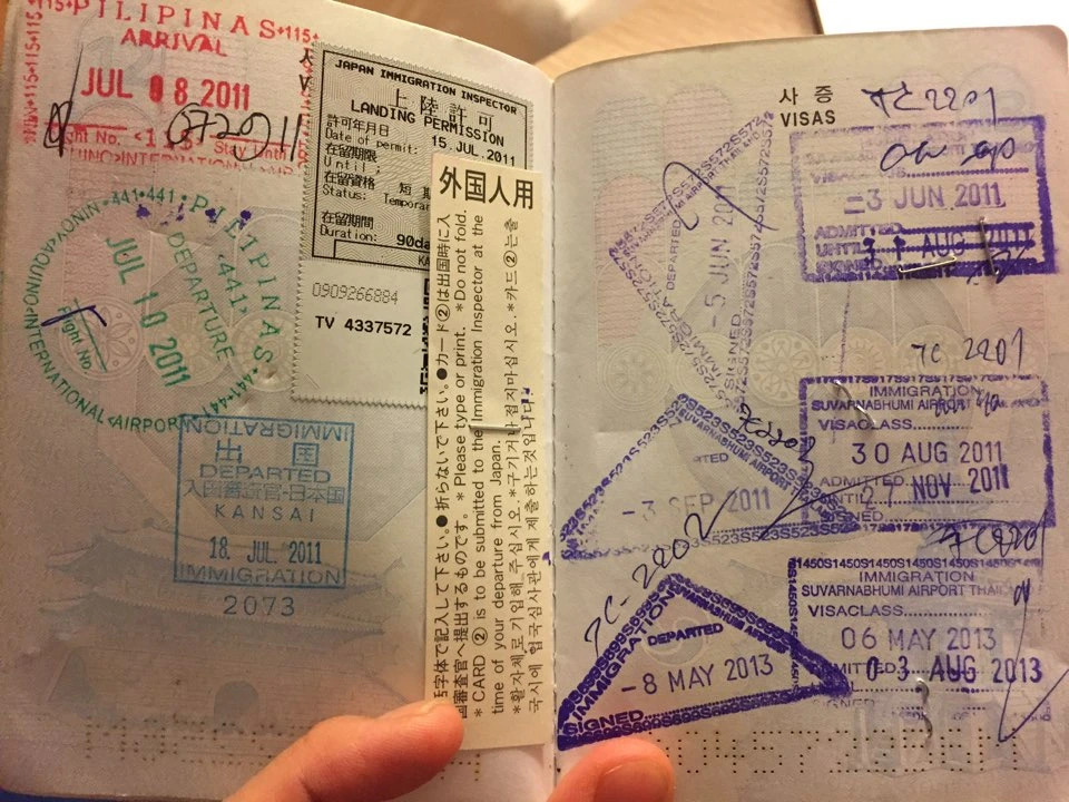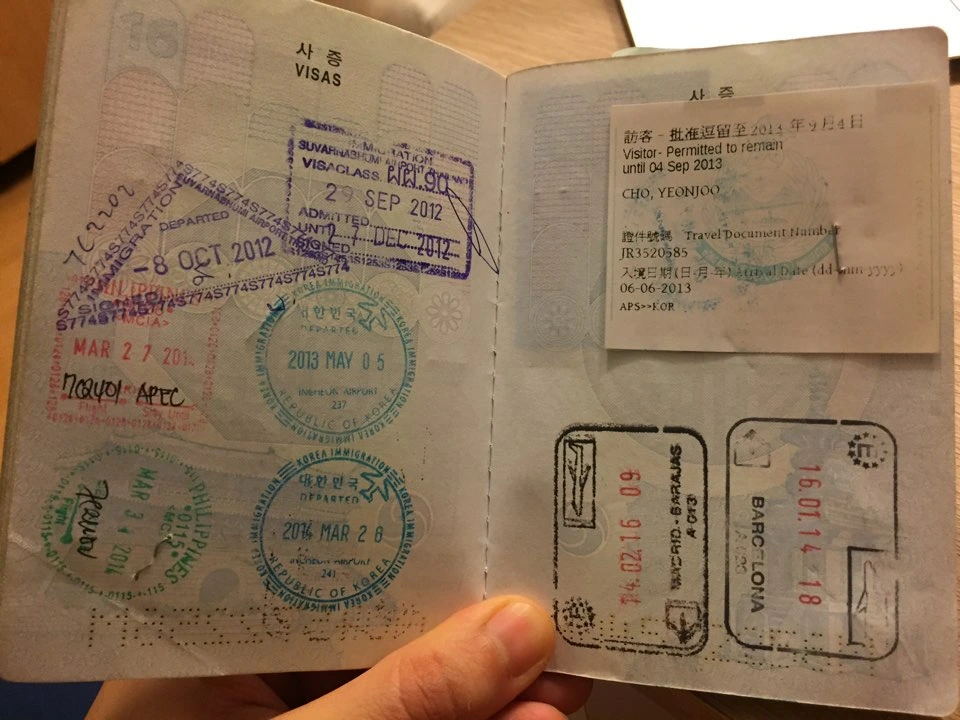 어디보자 이번엔 12년 9월 태국! 빠이에 다녀왔던 그 여행이구나..! 그리고 14년 3월 필리핀(세부)과 오른쪽 위는 13년에 갔던 세 번째 홍콩이고, 아래쪽에 쟤네는 뭐지 아.. 왼쪽 도장은 올해 (16년) 2월에 포르투갈에 갔다가 스페인 마드리드에서 출국한 도장이고 오른쪽 도장은 14년 1월에 이 직할 때 갔던 바르셀로나 도장이다.... 난 헷갈리는데 너희들은 같은 스페인이라고 같은 데다가 찍어준 거겠지....