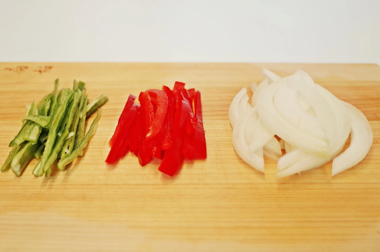 오이고추는 씨를 빼내고 양파와 파프리카와 같이 채썰어 주세요.