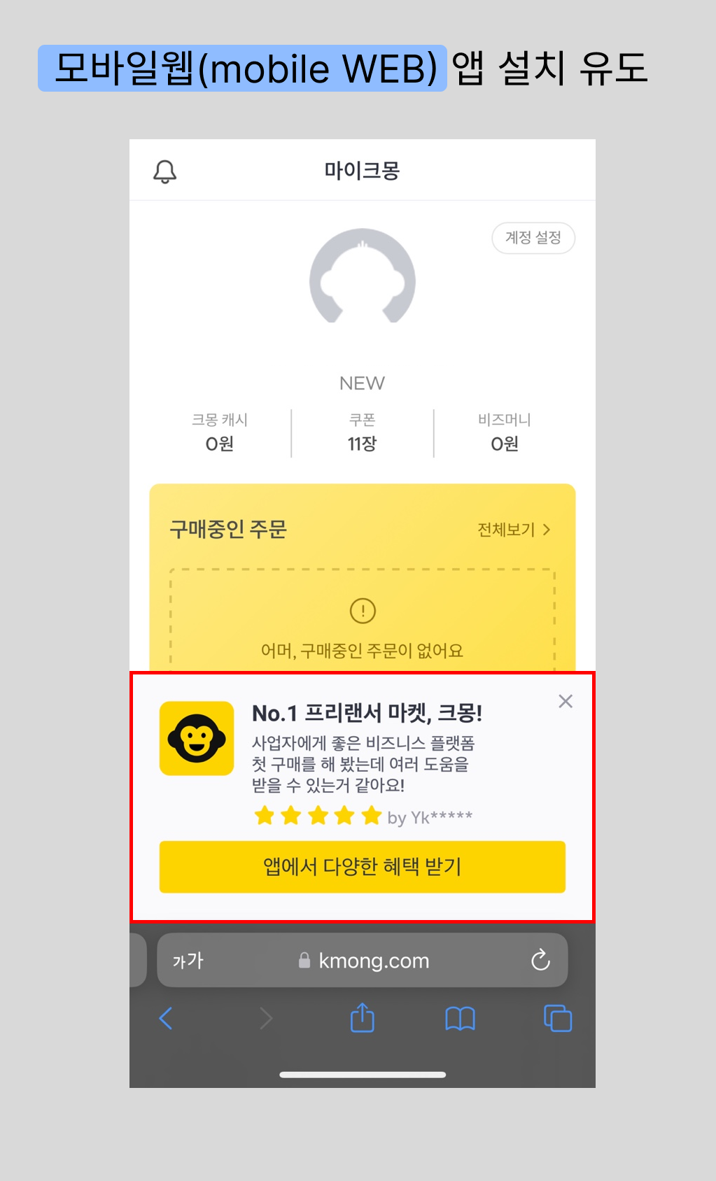로그인 후 마이페이지에 진입했을 때, 앱 설치 유도 하단 배너가 노출되었다. 콘텐츠 내용은 앱 리뷰를 활용했는데, 개인적으로 고객의 실제 리뷰를 활용하는 게 보는 이로 하여금 신뢰도를 주는 제일 좋은 방법인 것 같다.