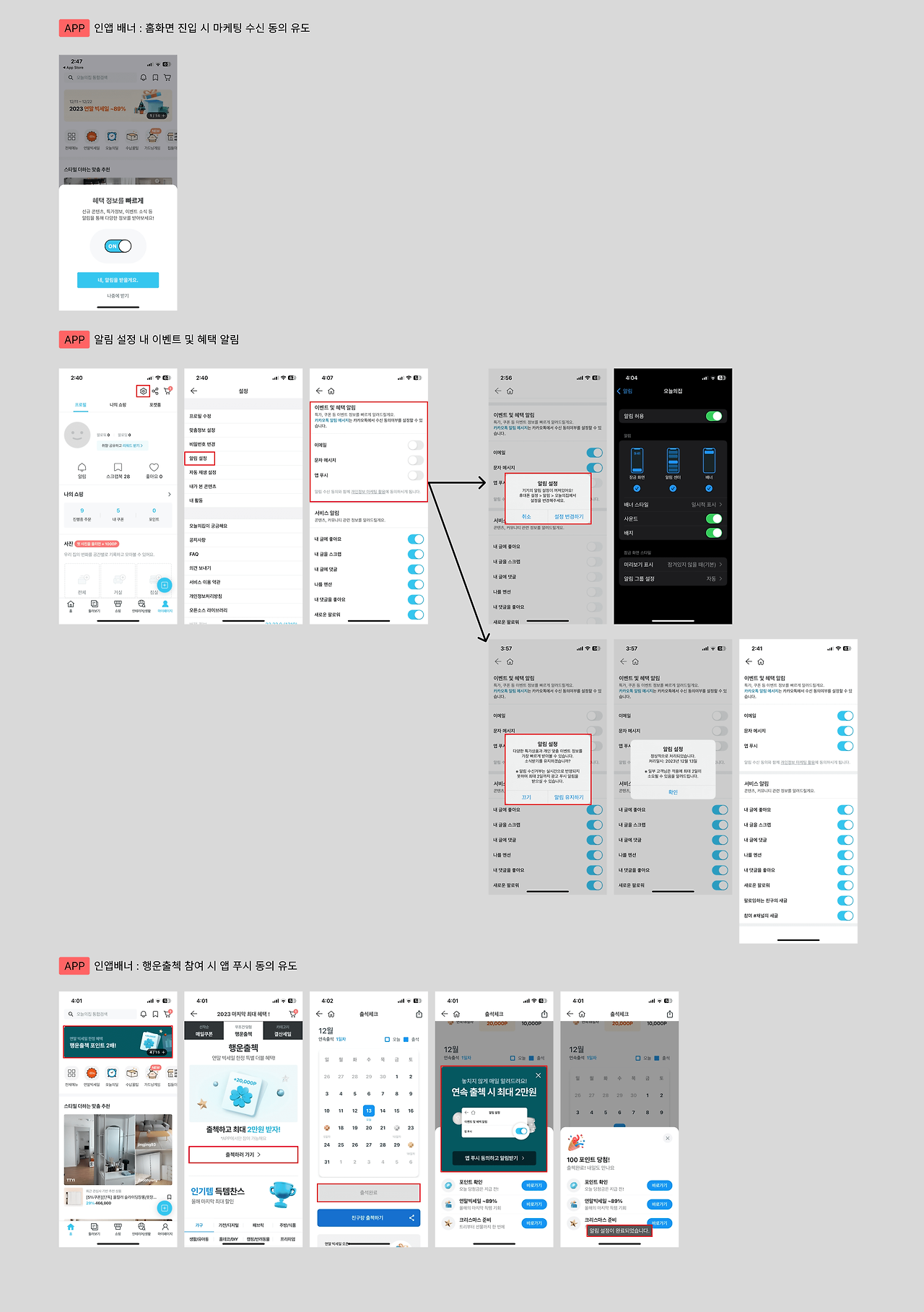 앱 푸시 알림 설정은 홈화면에서 유도하는 방법이 있었고, 행운출첵을 이용할 때 출석 체크 알림 푸시 유도 팝업이 있었다. 내부 데이터는 잘 모르지만 앱 푸시 수신율이 꽤나 높은 편이라 적극적으로 배너를 띄울 필요는 없었나 라는 생각이 들었다. (모바일웹 앱 설치 유도나 앱 설치 직후 로그인/회원가입 유도에 비하면 소극적인 편이었다)