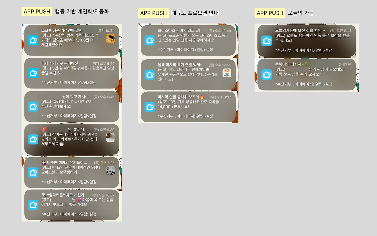 앞에서 언급했던 브랜딩을 이어서 이야기하자면, 앱 푸시의 경우 하루에 수십 개의 앱 푸시가 날아온다. (너무 많아서 잘 기억이 나지 않는다) 다만, 브랜딩 톤을 만들고 있는 곳은 앱 푸시 하나도 '아 여기서 왔구나'하고 기억이 남는다. 그렇지 않은 경우에는 머릿속에서 희석되기 쉽다. 앱 푸시 클릭률은 시간대나 이미지보다는 문구가 많은 영향을 끼치므로, 브랜딩팀과 함께 고민이 되면 좋을 것 같다는 개인적인 생각이다 :>