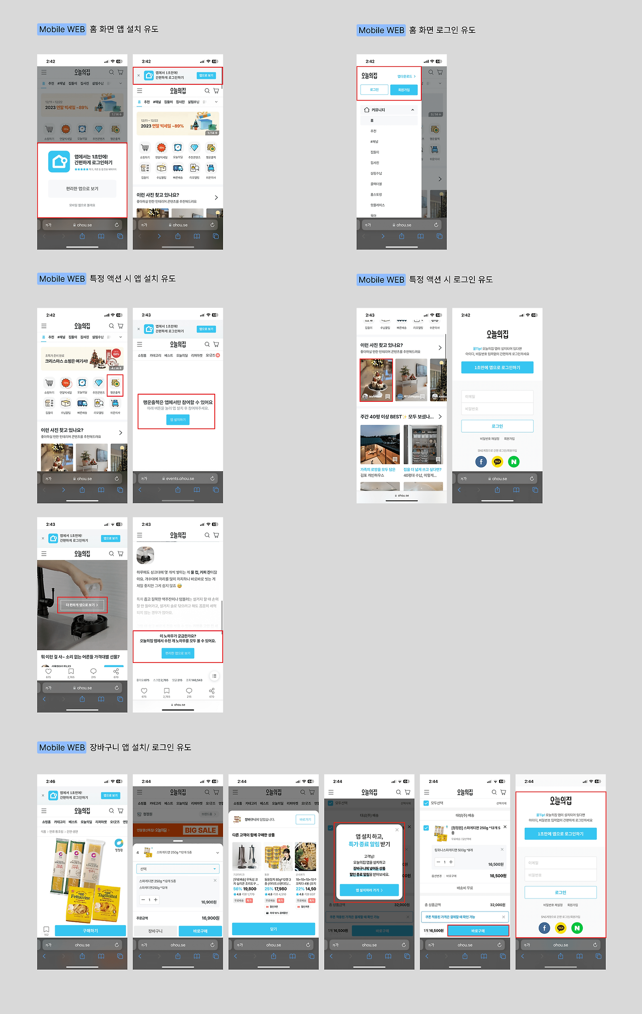 모바일 웹 홈 화면 진입 시 앱 설치 유도 하단 팝업이 노출되었고, 해당 팝업을 끄자 상단에 띠배너가 노출되었다. 로그인/회원가입 유도는 왼쪽 상단에 있는 햄버거 모양의 메뉴를 클릭해야 나타났는데, 로그인/회원가입은 특정 행동(메뉴바, 북마크, 장바구니 결제 시)을 했을 때 팝업창이 뜨는 경우가 다수였다.
