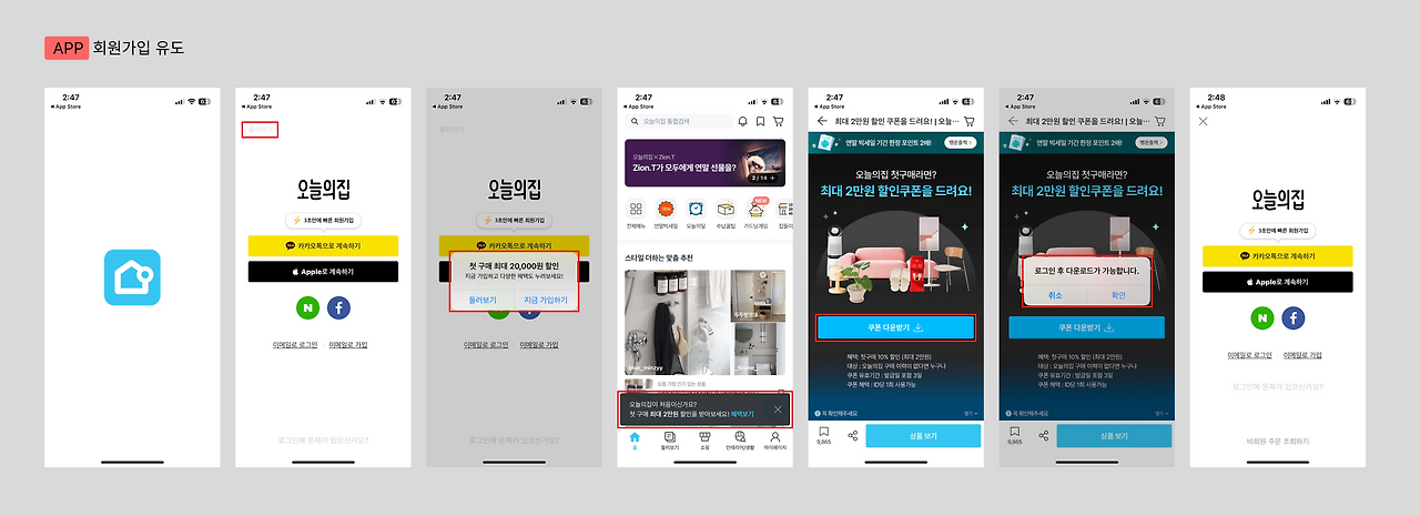 오늘의 집 모바일 웹과 앱에서 앱 설치/회원가입 유도 플로우를 간략하게 보면서 느낀 건 유저 동선에 맞춰 촘촘하게 플로우를 짰다는 점이다. 어떻게 해서든 앱 설치와 회원가입을 하게 만들겠다는 게 의도가 보인다. (실제 배너나 플로우별 전환율이 궁금해진다)