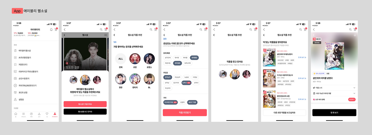 이번 포스팅을 준비하면서, 에이블리에서 웹소설을 시작하는 것을 알게 되었다. 허허 웹소설 취향을 선택하면 작품을 추천해준다. 작품은 로판, 로맨스가 메인이었고, 키워드와 기다무 그리고 베리(코인)을 활용하고 있었다. (성인인증을 하면 완전판도 앱에서 볼 수 있었다)