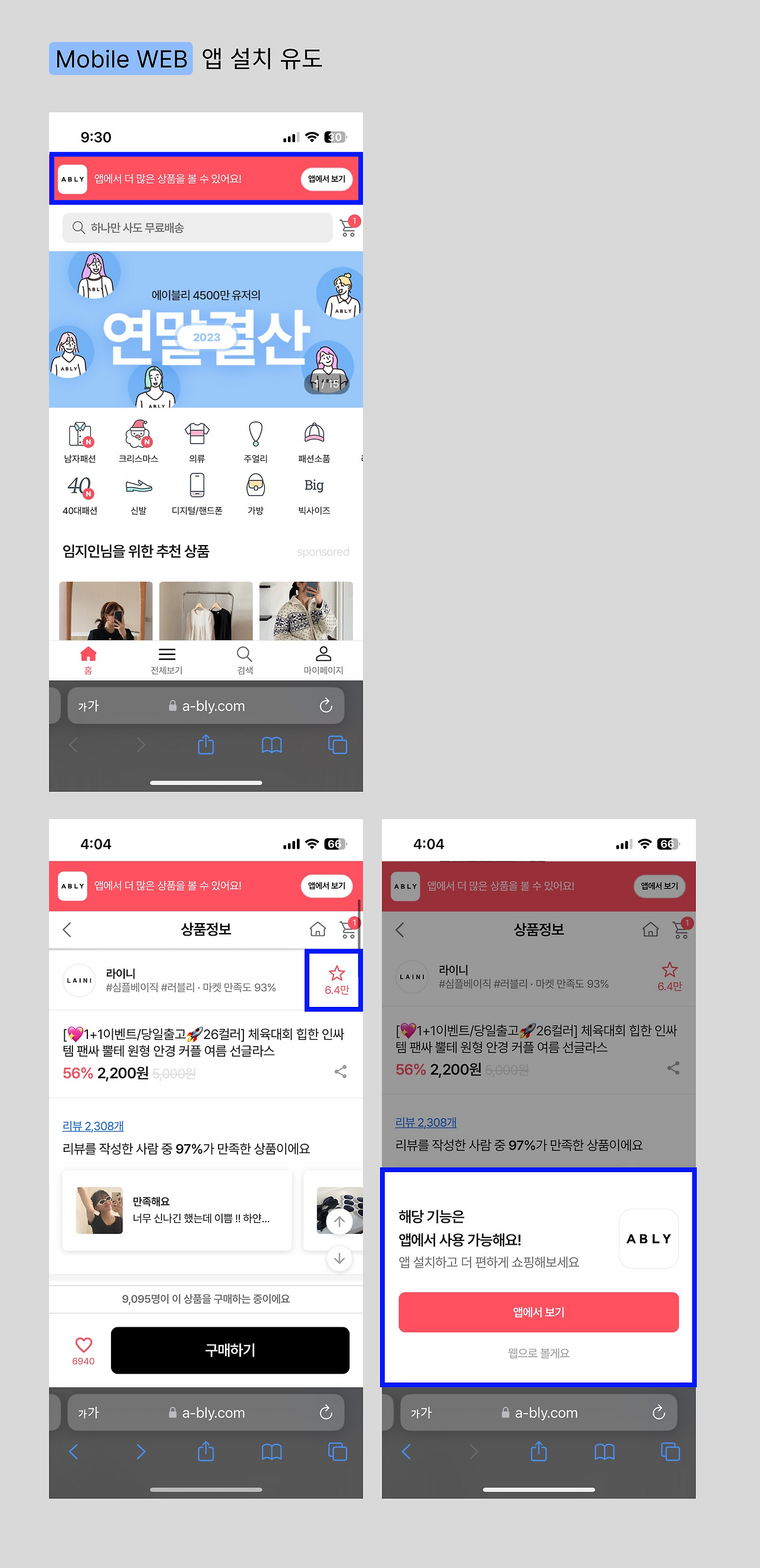 에이블리 모바일웹 진입 시, 별도의 모달 팝업이 노출되지 않았다. 다만, 상단 띠배너를 통해 앱 설치를 유도하고 있었다. 누적 회원 수 1천만 명을 돌파했다는 기사를 미루어 보아, 모바일 웹은 '앱 설치'에 더 중점을 두고 있었다.