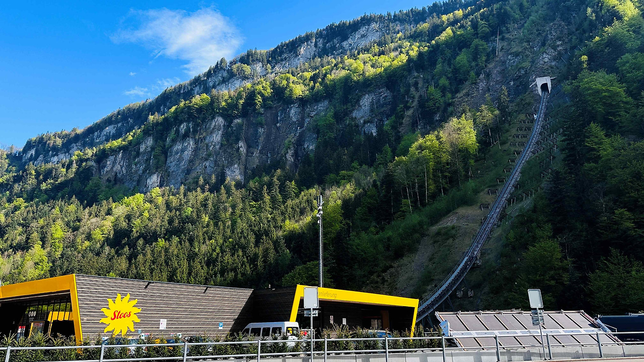 스투스의 유명한 푸니쿨라 올라가는 길. 저 경사를 올라간다고? 하고 놀랐는데 막상 푸니쿨라를 타니 경사가 하나도 느껴지지 않았다. 스투스는 저 오르막 끝에 있는 산속 마을이며 거기서 클링앤스톡까지 트래킹이 시작된다. 풍경이 매우 좋지만 리기산보고 온 사람들에게는 글쎄... 솔직히 루체른 부근의 트레일 코스 풍경은 비슷비슷하다.