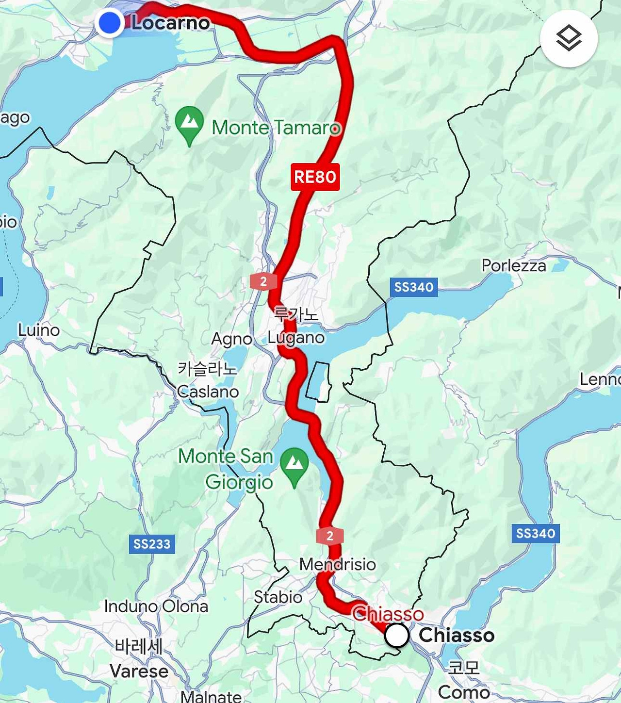 벨린초애서 성들을 구경하고 로카르노에서 호수변을 따라 걸었다. 아이스크림도 사먹었다. 마트인 COOP외에는 거의 돈 쓸 일이 없었는데(맨날 산속에만 있었으니까) 스위스 여행중 처음으로 단 맛을 맛본 때이다. 오른쪽 지도는 로카르노에서 스위스 국경도시인 Chiasso(키아소)로 가는 경로. 원래는 루가노를 가려고 했지만 갑자기 스위스가 식상해지기도 했고 이탈리아가 보고 싶어졌다. 키아소에 가서 도보로 이탈리아 Como로 넘어갔다. 10분 소요. 국경 사무소가 있어서 안되는 줄 알았는데 그냥 무사통과였다. 이탈리아에 오니 생기가 돌았다. 스위스와는 다른 뭔가 더 편안한 감성. 자유로운 무질서함 ㅋㅋ