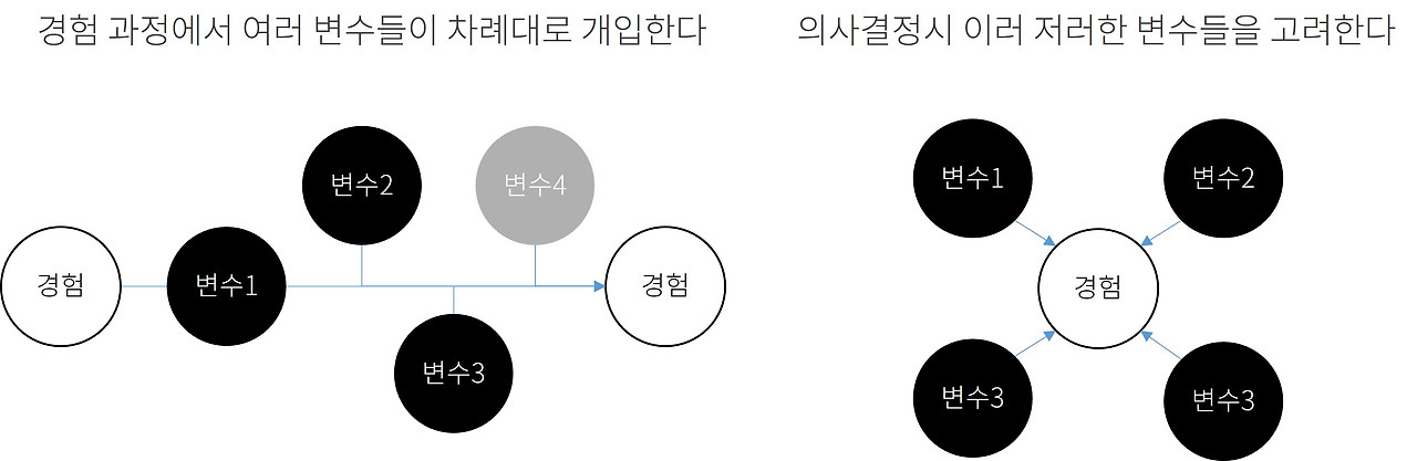 사람들이 겪는 경험은 변수가 깊이있게 맞닿아 있다. 우리는 '이러하면 꼭 이러하겠다'고 계획하거나 '이러해서 이러했다'고 과거를 회상하기도 하지만, '날씨에 따라서, 교통상황에 따라서, 눈길을 끄는 무언가가 있으면, 너무 많은 입력을 요구하지 않는다면..'과 같이 경험(결과)에 변수(원인)가 작용할 때도 많다.