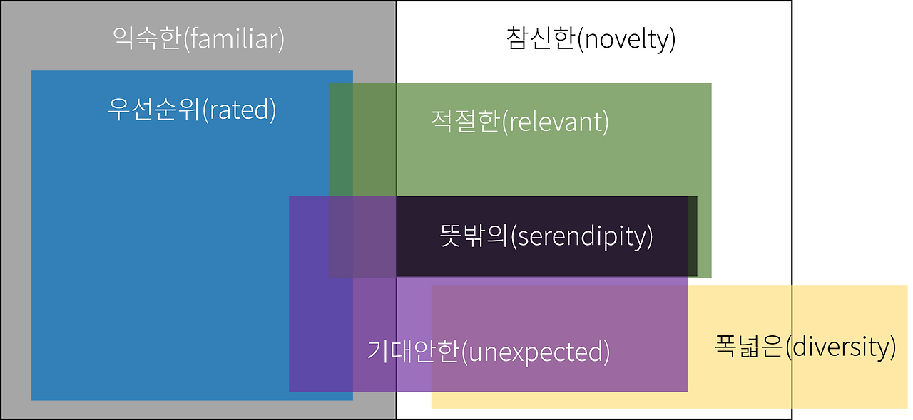 가장 기본적으로는 익숙한가? 참신한가?에 의해서 구분됩니다. 참신한 것들 중에서 적절하지만 기대안했던 추천 방식이 뜻밖의(serendipity)입니다. 왠지 마음이 설레어지는 단어죠? ㅎㅎ