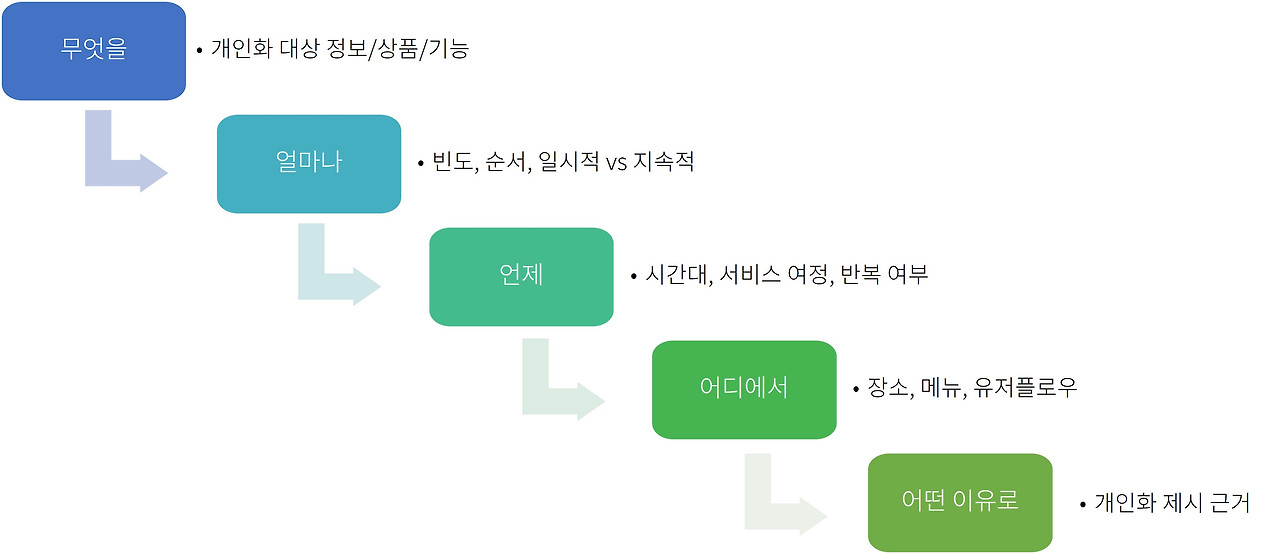 모든 개인화의 목적은 사용자 관심사를 서비스에 반영하는 것입니다. 디지털서비스가 사용자 관심사를 반영하기 위해서는 다음과 같은 체크리스트를 고려해야 합니다