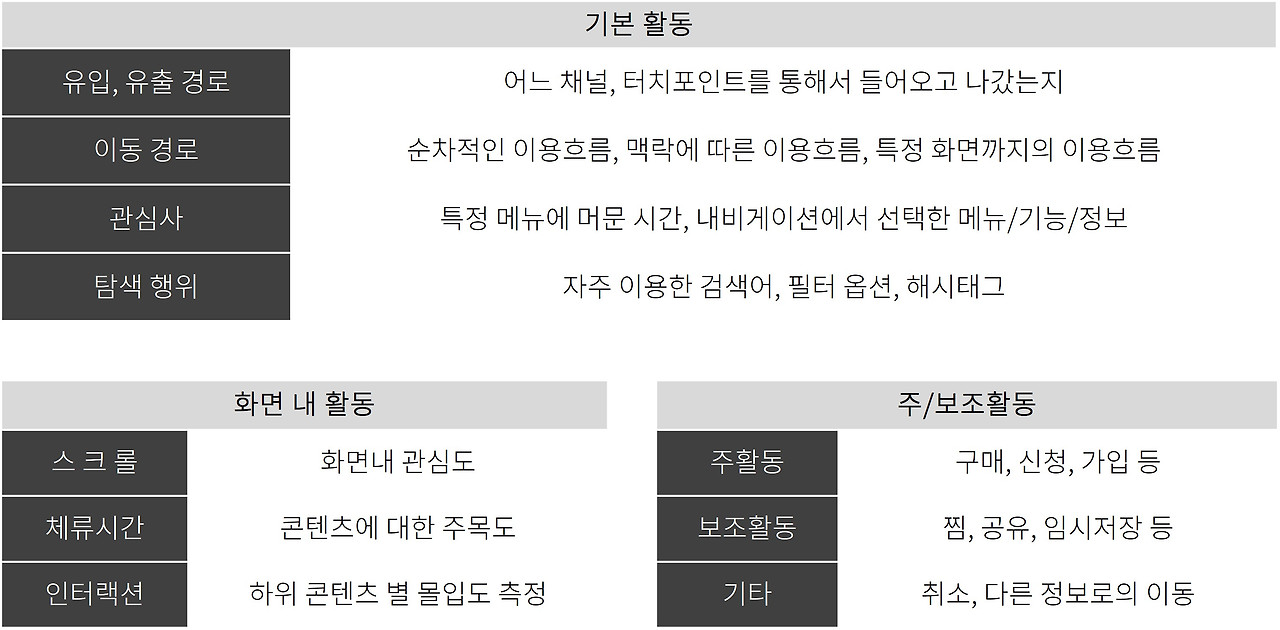 다행히 디지털 서비스는 여러 경로로 사용자의 데이터를 파악할 수 있습니다. 회원가입을 통해 얻을 수 있는 계정데이터 외에도 로그분석 툴을 통해서 활동데이터를, 온보딩 과정을 통해서 기록데이터를 얻을 수 있습니다