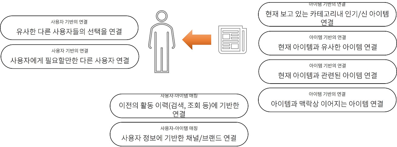 디지털 서비스에서의 유기적인 연결 방식은 사용자와 아이템(정보)간의 관계에 따라서 구분된다. 아이템만을 기본으로 한 연결도 있고 사용자만을 기반으로 한 연결도 있으며, 사용자-아이템을 매칭하여 연결하는 방식도 있다