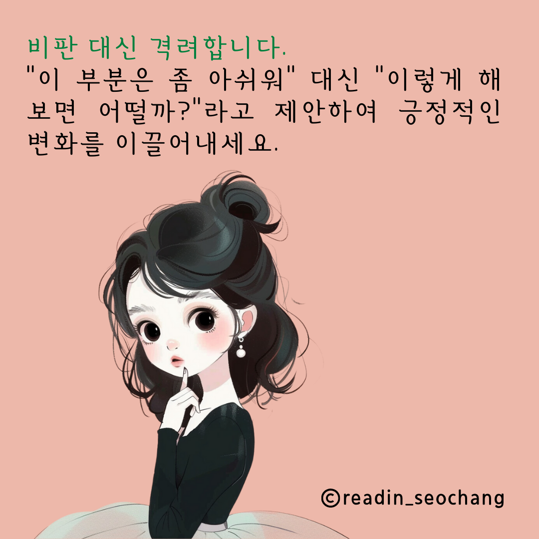 비판 대신 격려: 우리 모두 실수를 합니다. 실수를 지적하는 것보다는 격려하는 방식을 선택하여 "이 부분은 좀 아쉬워" 대신 "이렇게 해보면 어떨까?"라고 제안해 보세요. 이러한 접근은 상대방의 자존감을 지키면서 긍정적인 변화를 이끌어낼 수 있습니다.