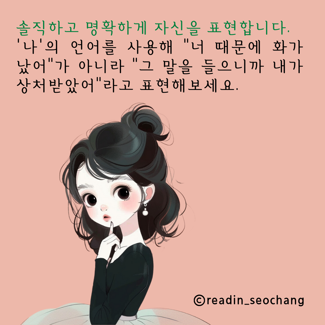 명확한 표현: 자신의 생각과 감정을 솔직하고 명확하게 표현하는 것이 중요합니다. 이 때 '나'의 언어를 사용하여 "너 때문에 화가 났어"가 아닌 "그 말을 들으니까 내가 상처받았어"라고 표현함으로써, 대화를 더 건강하고 생산적으로 이끌 수 있습니다.