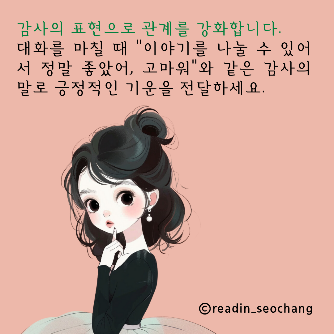 감사의 표현: 대화를 마칠 때 감사의 말을 전하는 것은 상대방을 더욱 빛나게 하고, 관계를 강화합니다. "이야기를 나눌 수 있어서 정말 좋았어, 고마워"와 같은 감사의 말은 상대방에게 긍정적인 기운을 전달합니다.