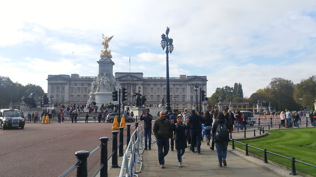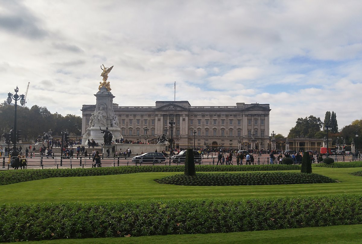 빅토리아 여왕 기념비(Victoria Memorial) 너머로 위풍당당한 버킹엄 궁전이 보인다.