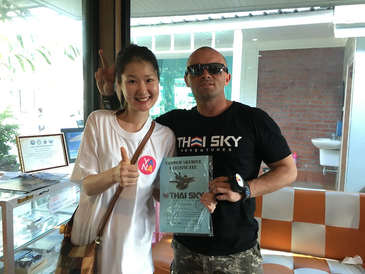 스카이다이빙을 마치면 동영상을 USB로 받아볼 수 있다. 그리고 멋진 수료증과 함께 나하고 같이 뛴 강사를 찾아 인증샷도 남겼다. 다음에 스카이다이빙 할 때는 지금보다 덜 떨겠지? ㅎㅎ