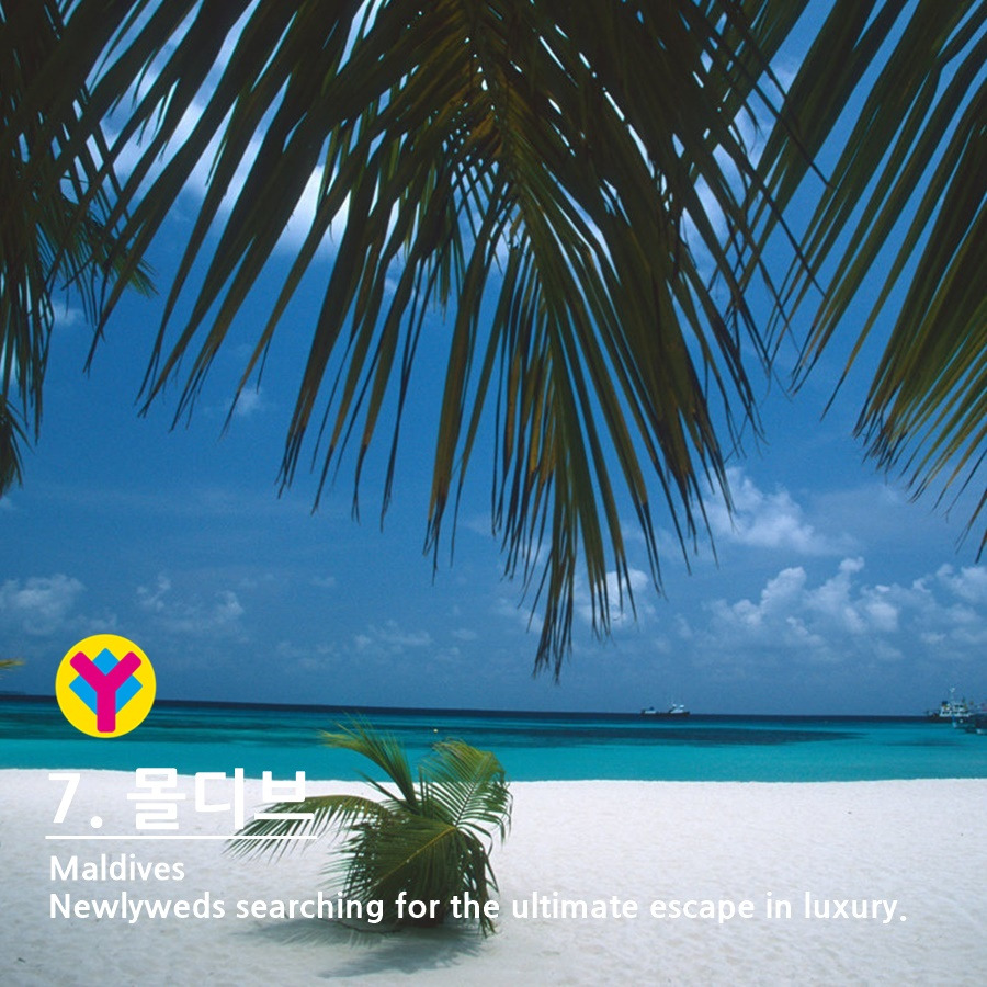 Why go: 바쁜일상과 현실에서 벗어나고 싶다면, 몰디브로 가라. 이 외딴 섬 체인은 고립과 로맨스로 넘쳐 흐른다. 리조트의 호화로운 서비스와 편의 시설은 개인 방갈로를 떠나길 원하지 않을 것이다. 늘 변함없이 전세계 신혼여행객에게 인기있는 아름다운 휴양지 몰디브.