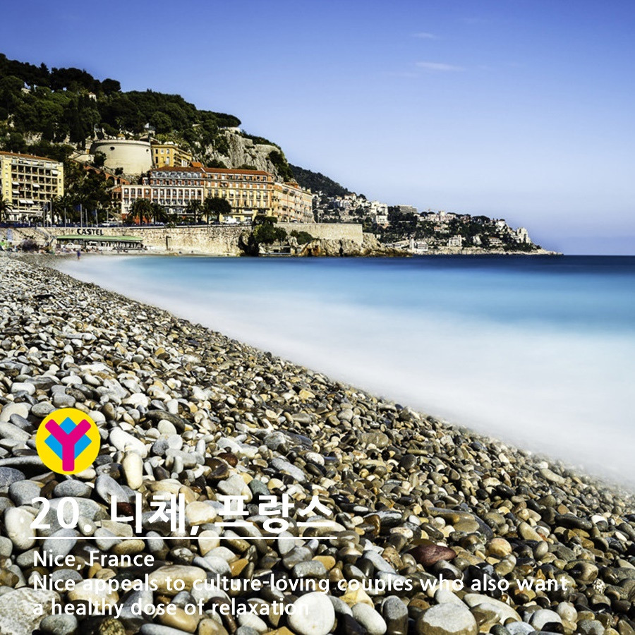 Why go: 니스는 사시사철 따사로운 햇빛이 비추는 프랑스 남부 지방의 아름다운 휴양도시이다. 유럽인들이 사랑하는 대표적인 휴양지 중 하나이며 길고 아름다운 해변이 관광객들을 사로잡는다. 여름에 니스를 간다면 해변으로 가는 것이 가장 좋고 여름 외의 계절에 간다면 마티스 미술관과 샤갈 미술관을 둘러보고 시내를 구경하는 것이 좋다. 설탕에 절인 과일과 생선요리 역시 빼놓을 수 없는 니스의 먹거리이다.