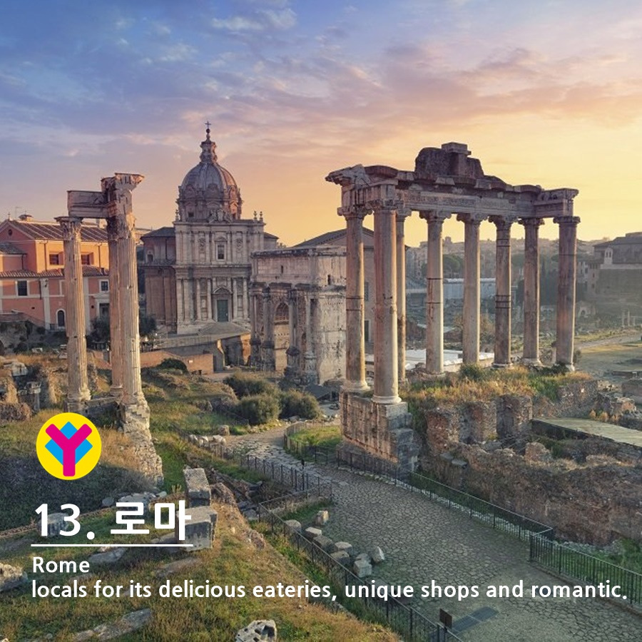 Why go: 2,500여년의 역사를 자랑하는 이탈리아의 수도. 로마는 고대의 유물 유적이 워낙 많아 지하철이 발달되어있지 않다. 그래서 여행을 할 때는 버스를 이용하거나, 가능하다면 도보로 여행을 많이 한다. 콜로세움, 바티칸 시국, 포폴로 광장, 테르미니역 네 꼭짓점 이내에 대부분의 관광명소들이 밀집해있어 여행코스로 많이 애용된다. 고대 로마 유적지 뿐만 아니라 피자, 파스타 같은 현지음식도 유명하다.