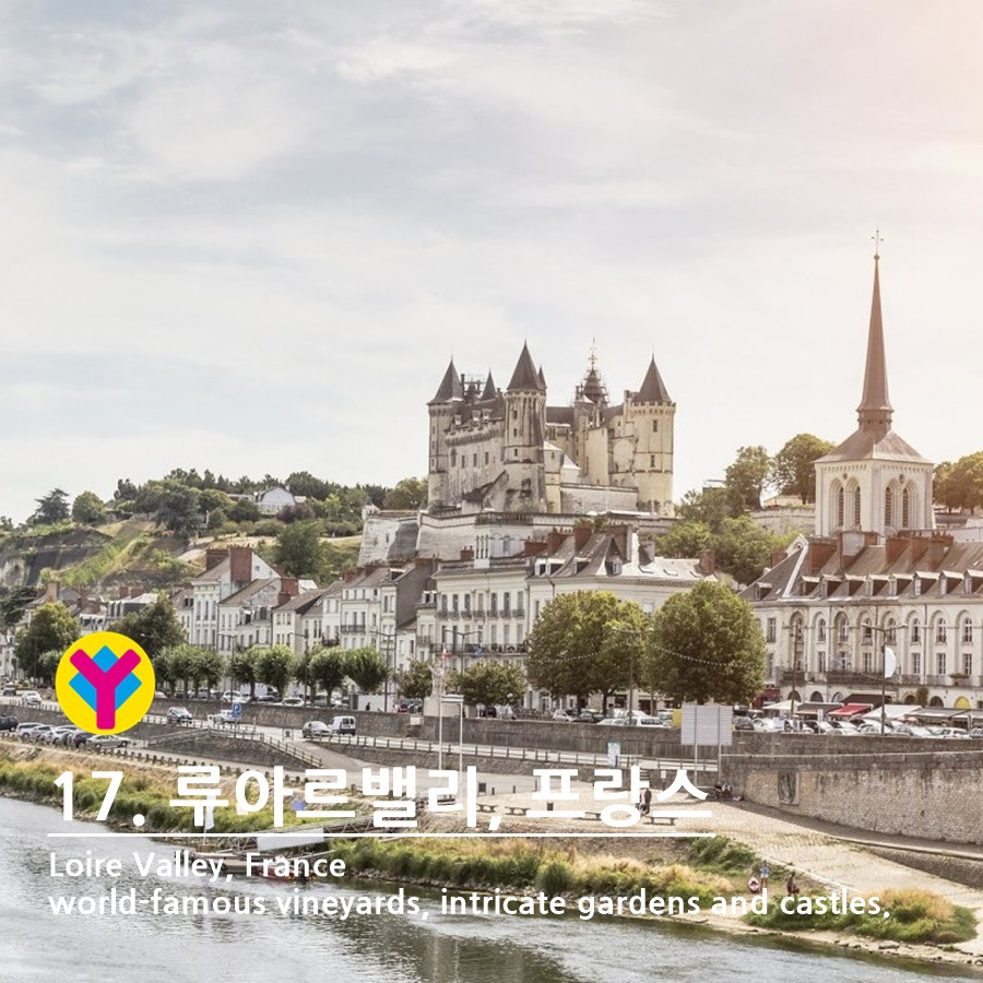Why go: 프랑스 와인으로 유명한 루아르밸리. 프랑스에서 가장 긴 루아르(Loire) 강을 따라 펼쳐진 전원적인 풍경 덕분에 ‘프랑스의 정원’이라 불리는 루아르. 루아르는 프랑스 최대의 와인산지 중 하나이며, 마시프상트랄에서부터 브르타뉴에 이르는 1천여 킬로미터의 광활한 지역을 포함한다.