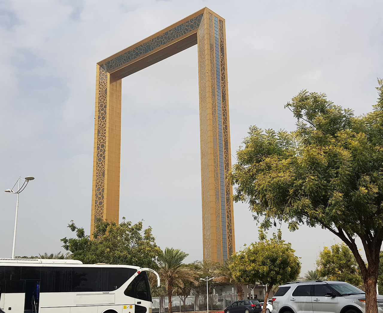두바이 프레임은 부르 두바이(Bur Dubai) 지역의 자빌파크(Zabeel Park) 내에 세워져 있다. 황금빛 프레임(액자)가 우뚝 솟아 있는 모습은 멀리서 바라만 보아도 거대한 위풍당당함이 넘친다. 현대 건축공학의 최첨단 기술이 빚어낸 금빛 액자로의 특별한 여행을 떠나보자.