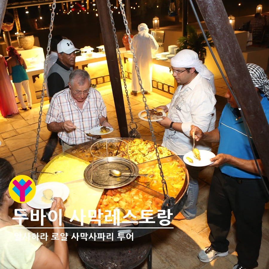 5성급 호텔 뷔페식으로 맛깔스러운 고급 아랍음식 및 인터내셔널 뷔페를 즐길 수 있다. 일반적으로 사막사파리 투어에서 제공하는 아랍음식과는 차원이 다르다. 고급 레스토랑에서의 5성급 호텔에서 제공하는 음식 서비스를 맛있게 맛볼 수 있다.