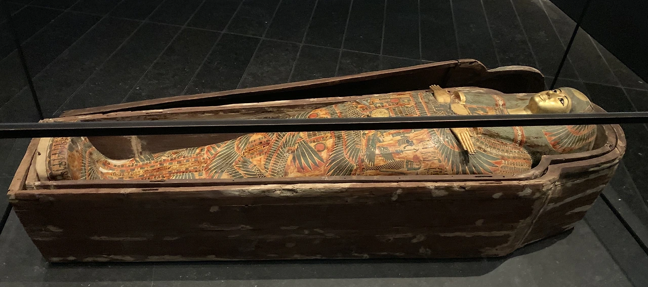 고대 이집트의 파라오 조각상과 미라를 감싸고 있던 관과 내장품,