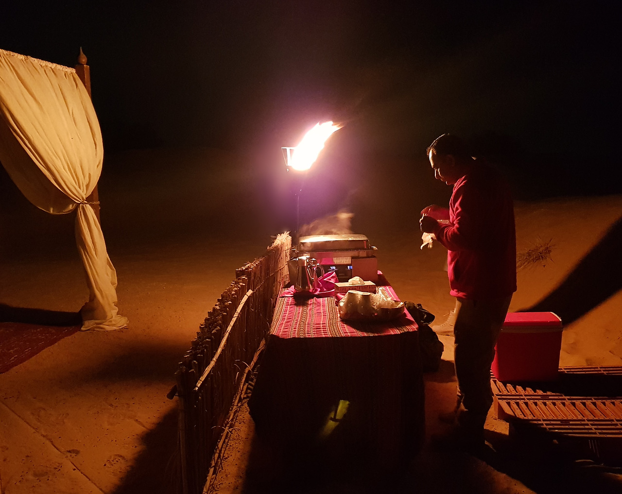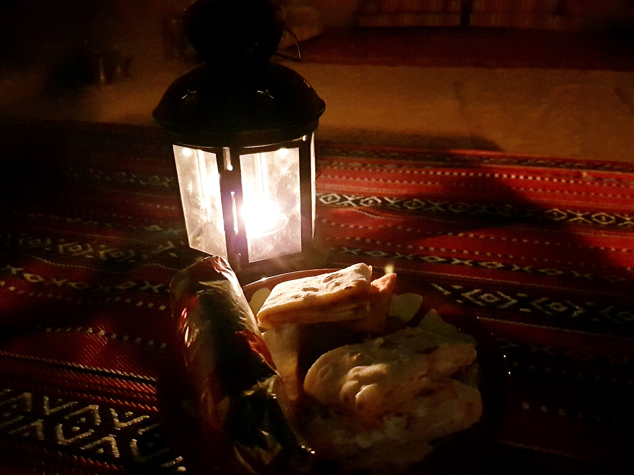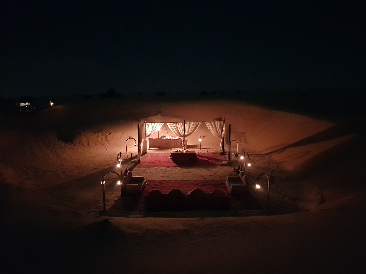 하얀색 천으로 된 케노피 아래로 붉은 카펫과 아랍식 테이블이 놓여 있고 테이블 위에는 램프가 켜져 있다. 그 옆으로는 작은 조리대가 있고, 케노피와 그 주변을 밝히는 여러 개의 등이 꽤나 그럴 듯한 분위기를 연출하고 있었다. 나를 위해 누군가가 사막 한 가운데에 이런 세팅을 해 두었다니...