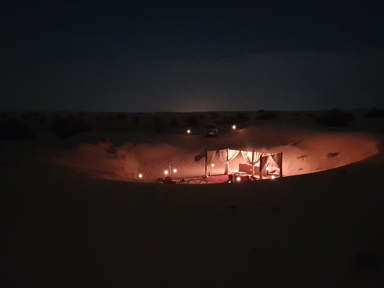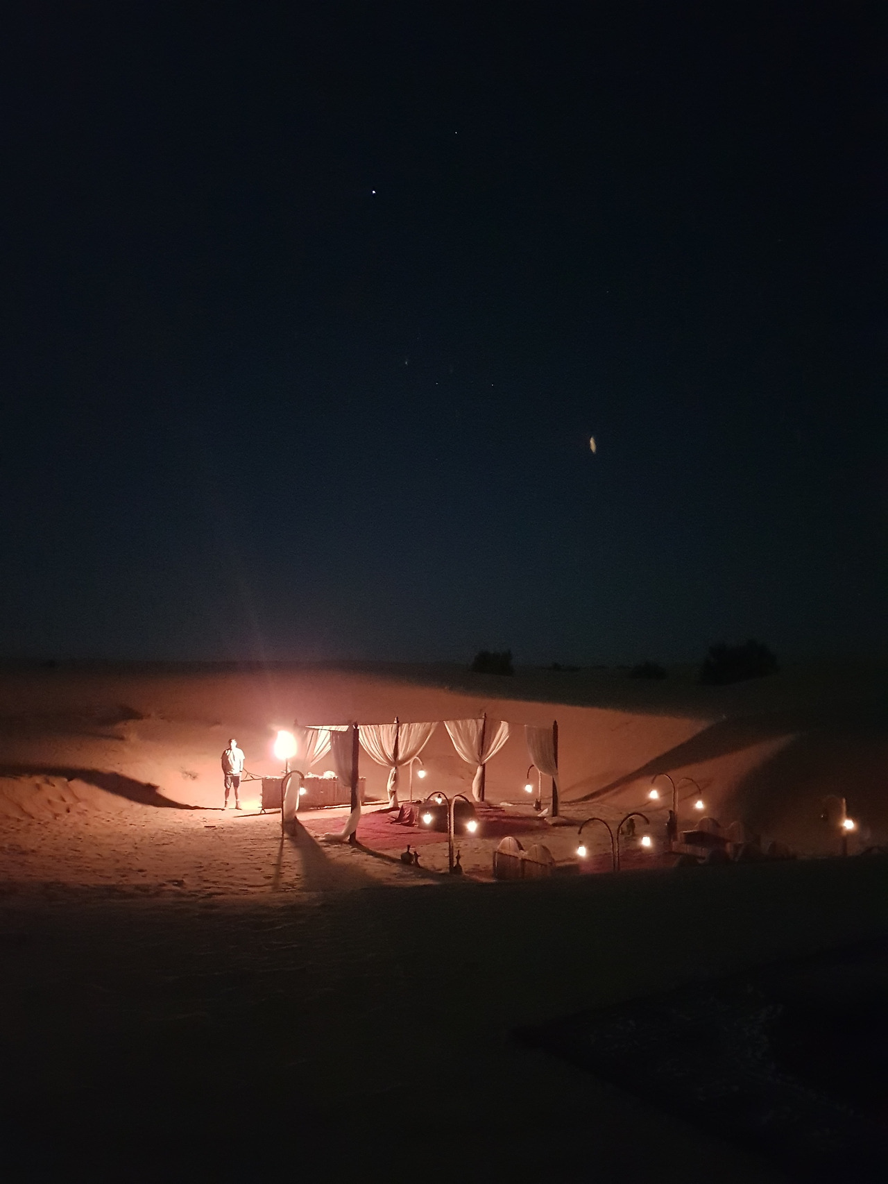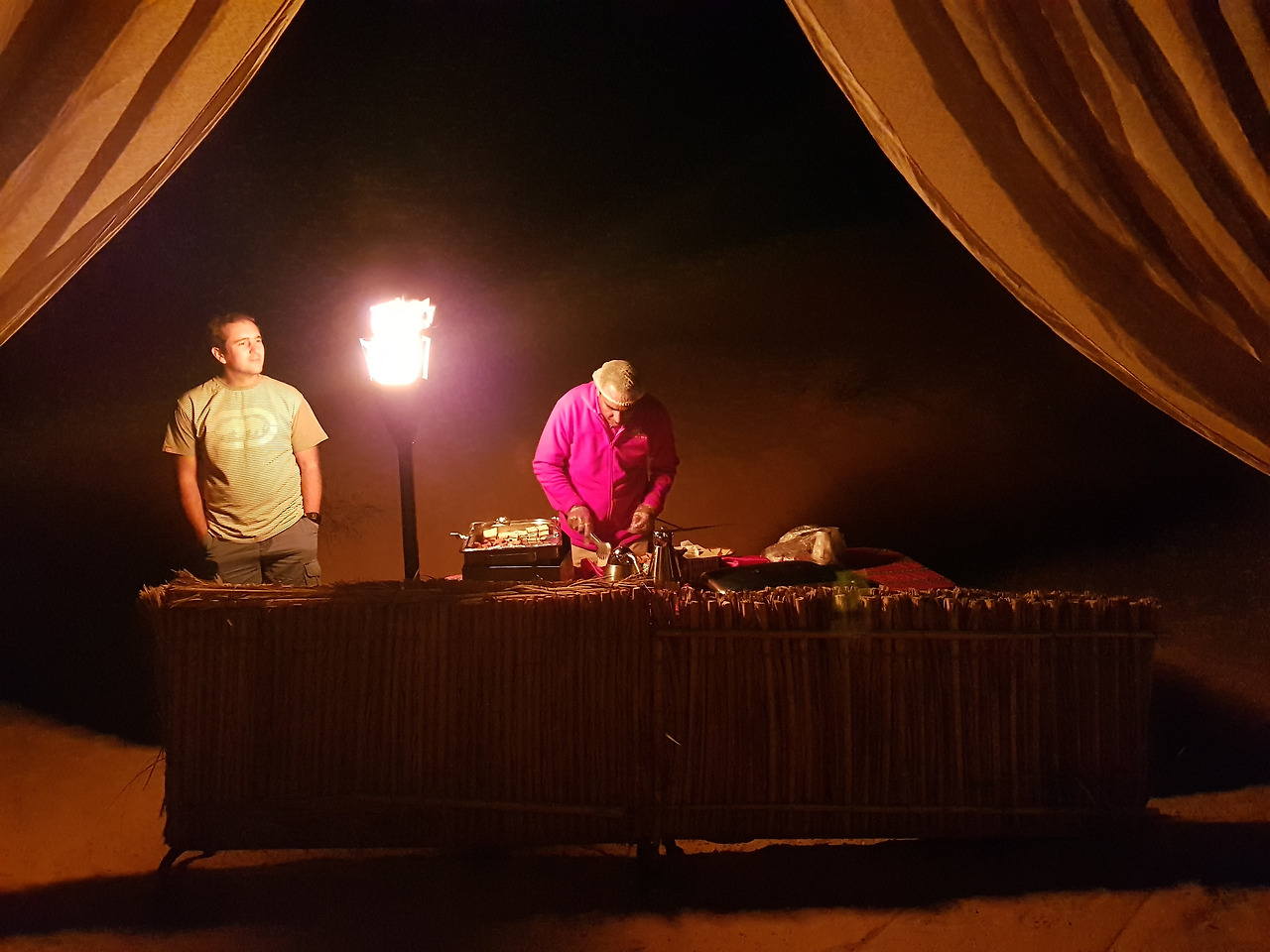 하얀색 천으로 된 케노피 아래로 붉은 카펫과 아랍식 테이블이 놓여 있고 테이블 위에는 램프가 켜져 있다. 그 옆으로는 작은 조리대가 있고, 케노피와 그 주변을 밝히는 여러 개의 등이 꽤나 그럴 듯한 분위기를 연출하고 있었다. 나를 위해 누군가가 사막 한 가운데에 이런 세팅을 해 두었다니...