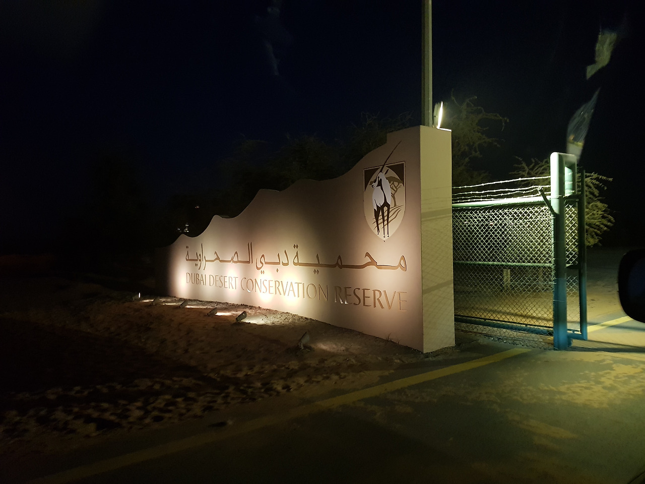 두바이 사막보호 구역(Dubai Desert Conservation Reserve)라는 입구의 글귀가 조명을 받아 선명하다.