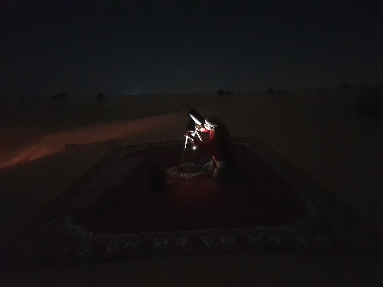 갑자기 드라이버와 가이드가 테이블이 세팅된 옆 쪽의 모래 언덕에서 뭔가를 열심히 하고 있다. 가까이 다가가서 보니 카펫을 깔고 그 위에 천체망원경을 설치하는 것. 달을 보게 해 주려는 것이다. 커다란 렌즈를 끼우고 촛점을 맞추는 모습이 사뭇 진지하다. 애 쓰는 그에게 커피 한 잔을 가져다 주었다. 고맙다며 웃는 얼굴이 어둠 속에서도 환하다.