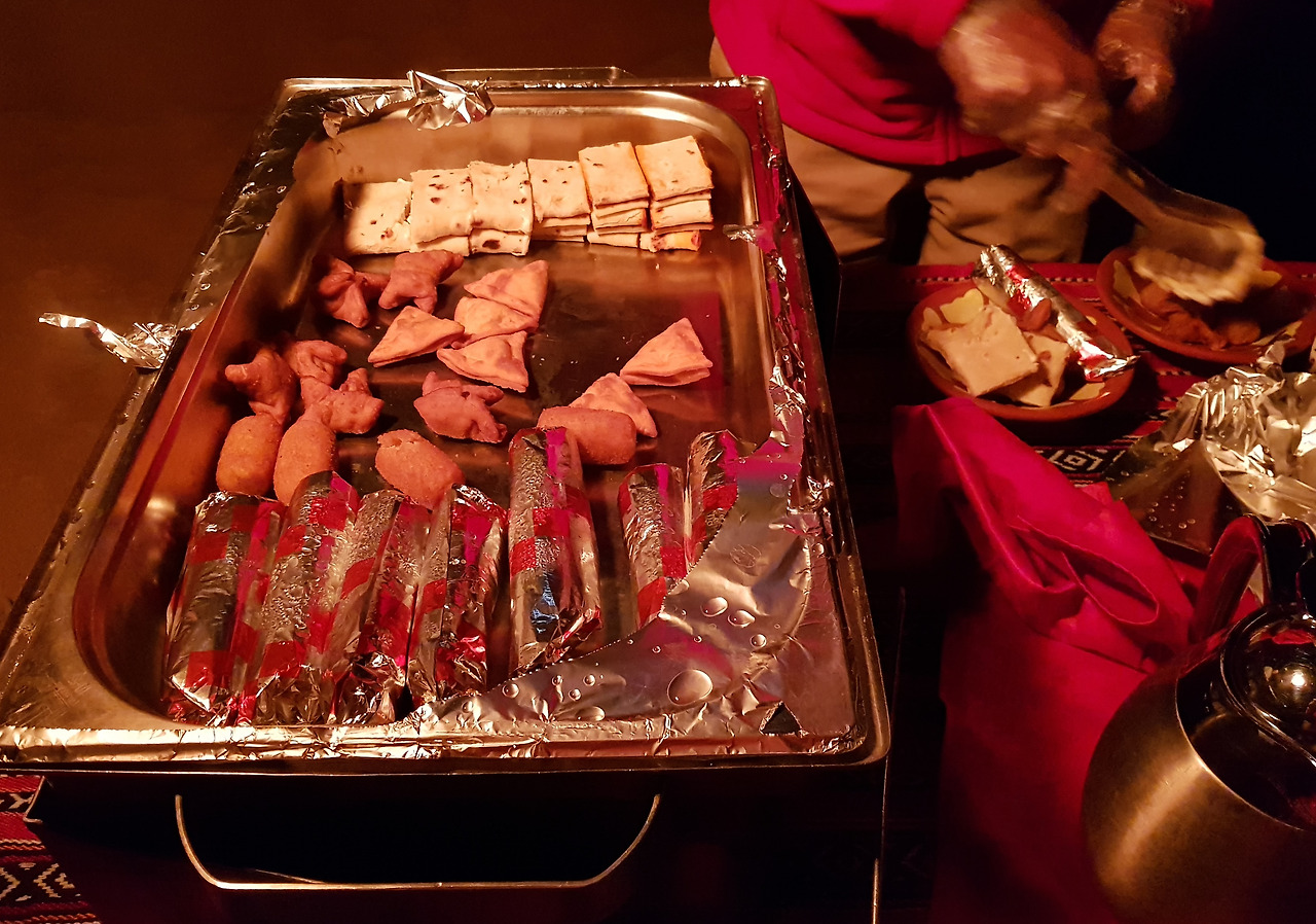 드라이버는 조리 테이블로 가더니 갑자기 요리사가 된다. 따뜻하게 준비해 둔 몇가지 아랍식 핑거푸드와 스낵, 차를 정성스럽게 세팅해서 내게 가져다 준다. 적당히 출출하던 나는 간단한 간식에도 기분이 매우 좋다. 사막의 별빛을 바라보며 마시는 홍차 한잔에 마음까지 따스해진다.