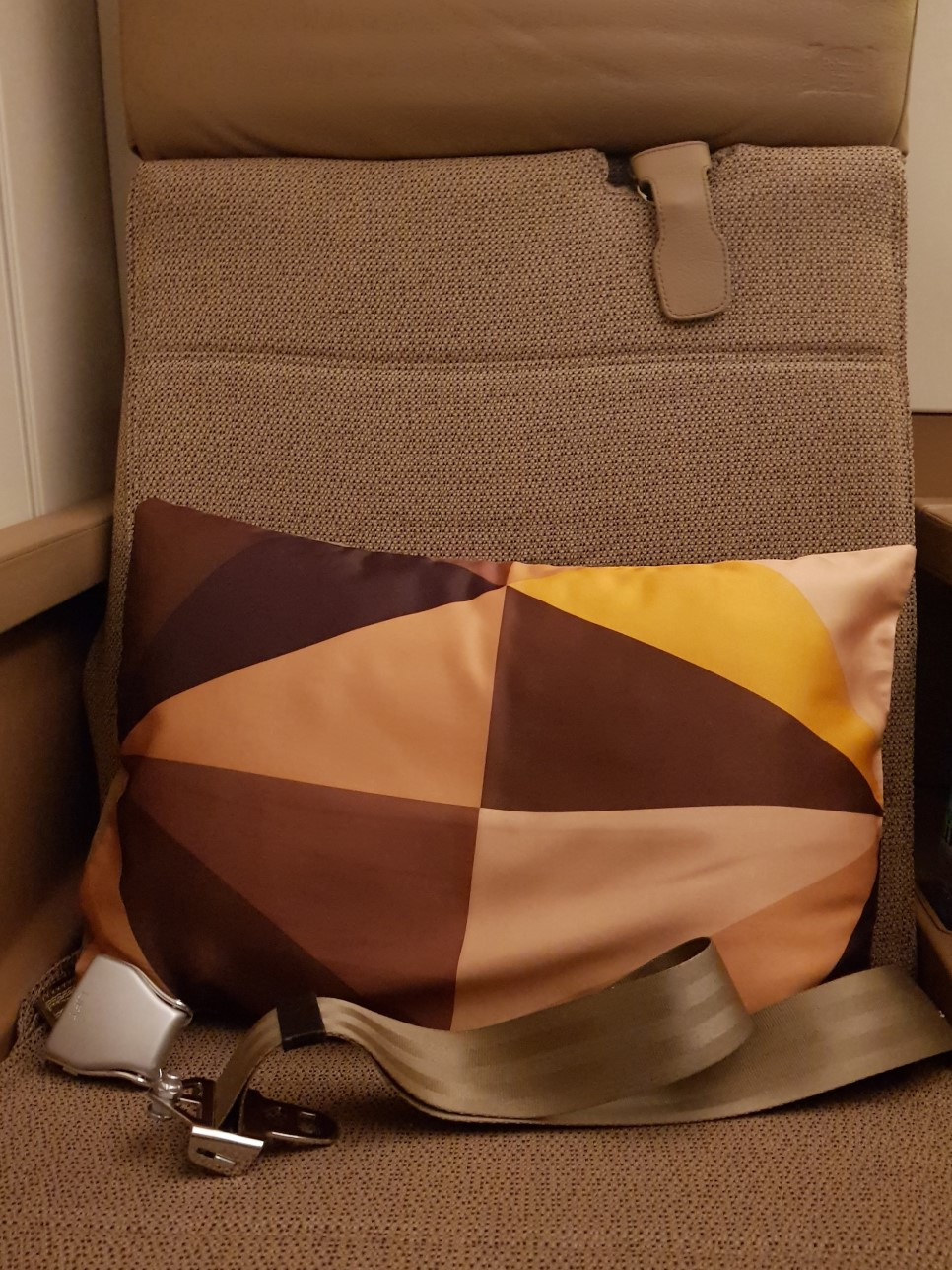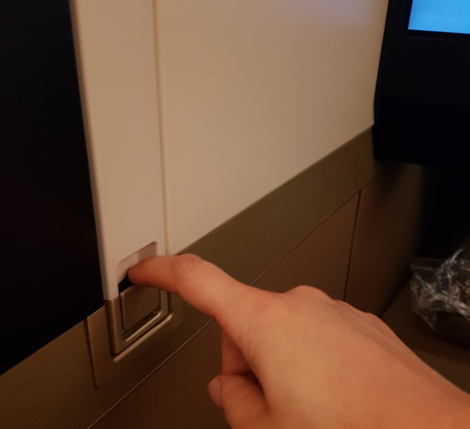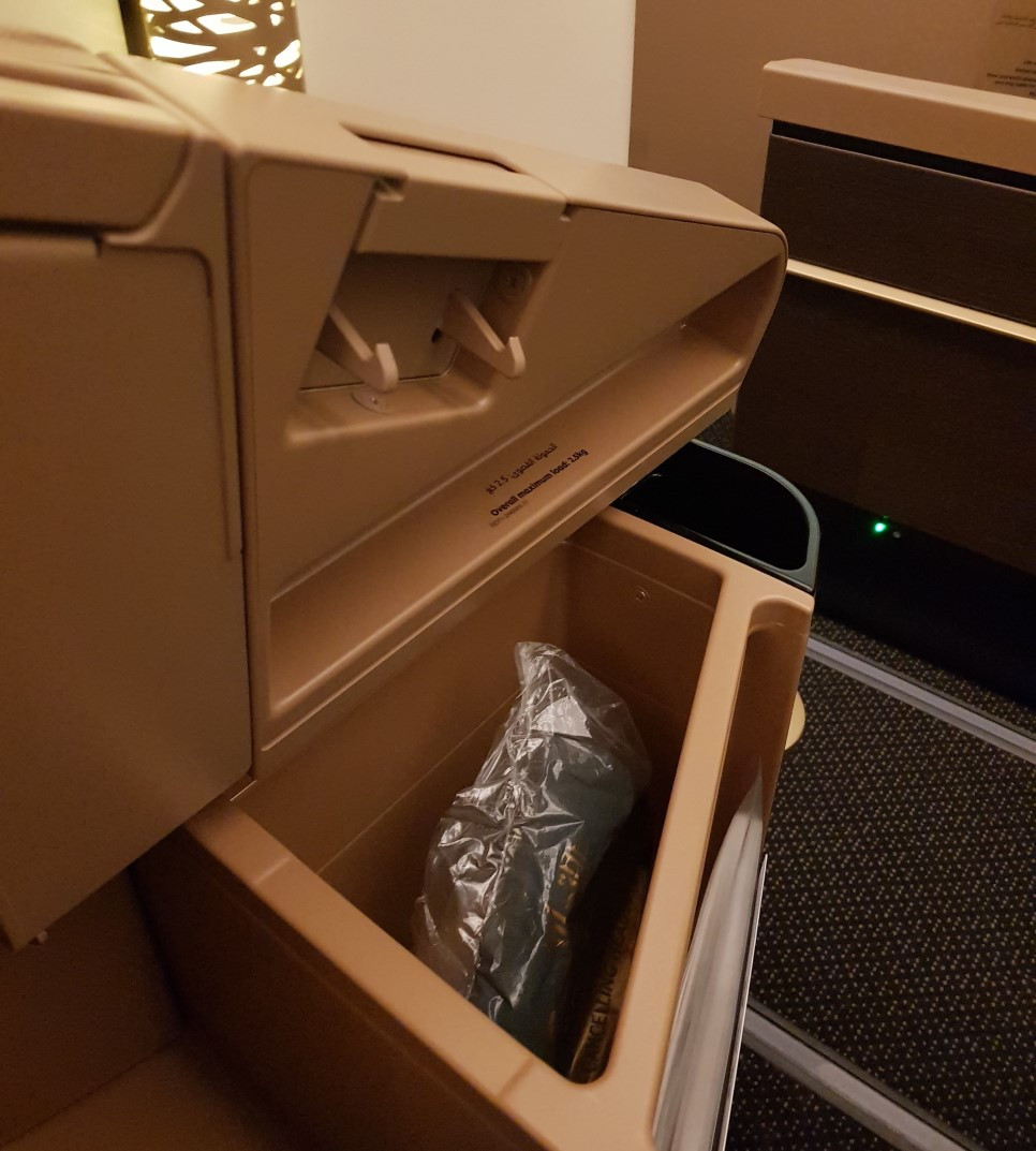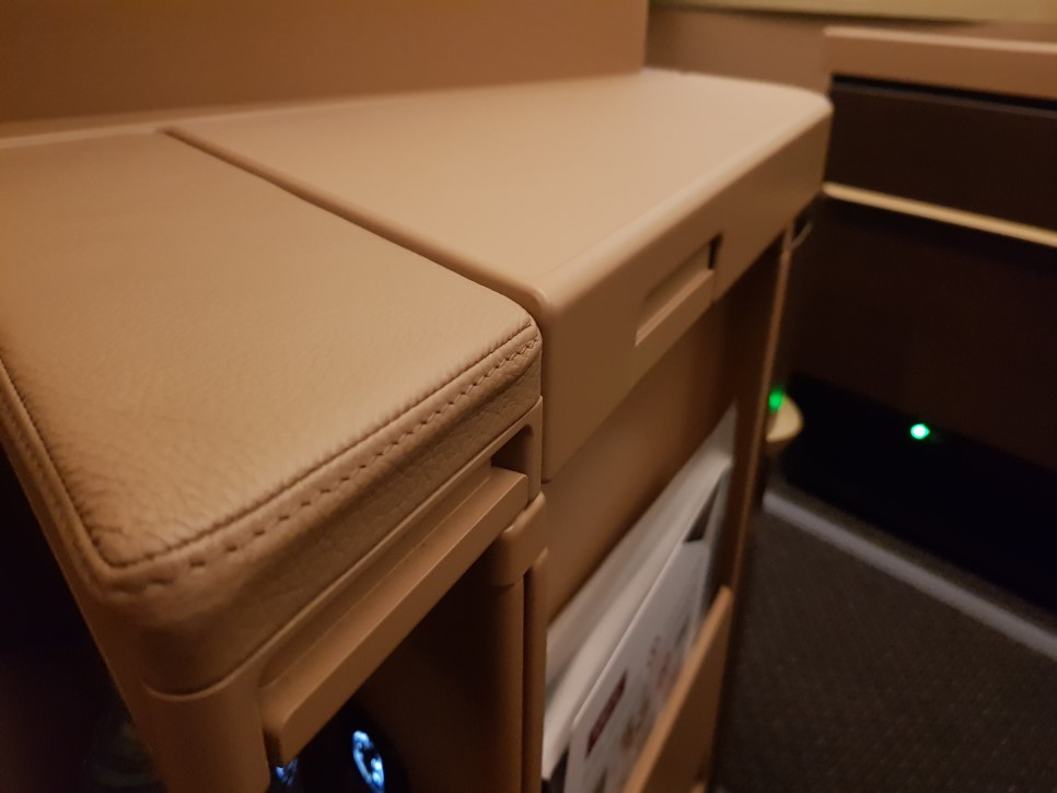 어메니티 파우치 안에는 취침 안대, 양말, 귀마개, 치약, 칫솔, 핸드크림, 향수 등등이 들어있고, 좌석 왼쪽에 매거진 꽂이 위쪽 덮개를 열면 헤드셋이 있다. 소음 제거 헤드셋이어서 수면을 취할 때도 용이하다. 기내 와이파이와 실시간 위성 TV는 유료 서비스로 제공한다.