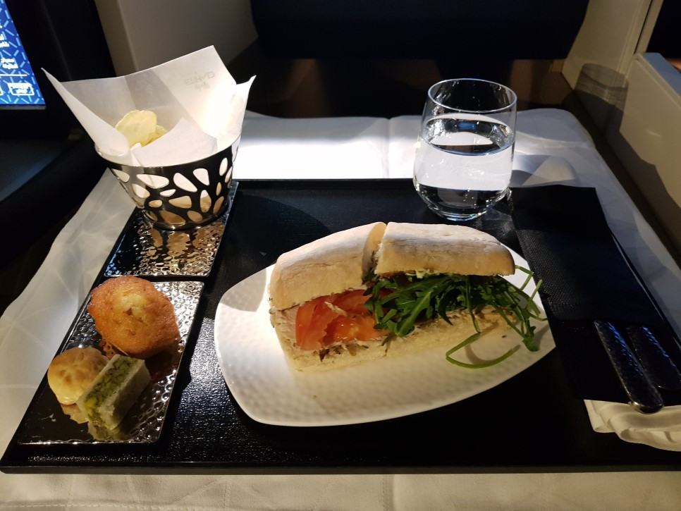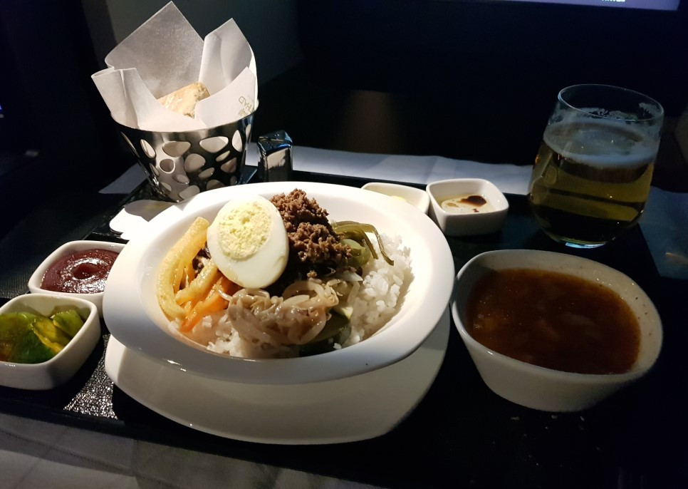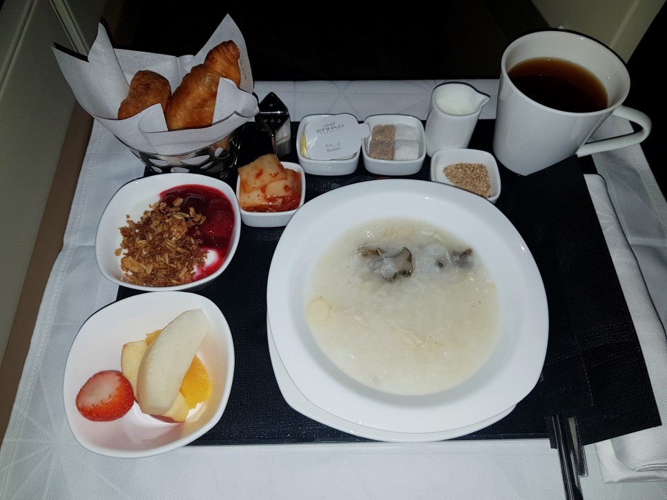 이륙 후, 그리고 착륙 전 두 차례에 걸쳐 제공되는 식사는 전반적으로 퀄리티가 상당히 높은 편이다. 특히 빵 종류가 맛있고, 고기럽고 느끼하지 않다. 착륙 전에 제공되는 아침식사로는 소화가 잘되는 유동식이 좋을 것 같아서 닭죽을 주문했더니 반찬에 김치가 곁들여 나왔다.
