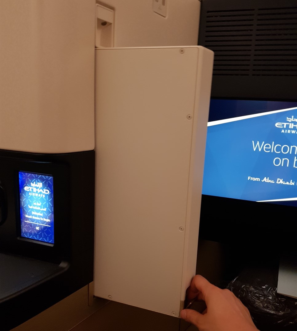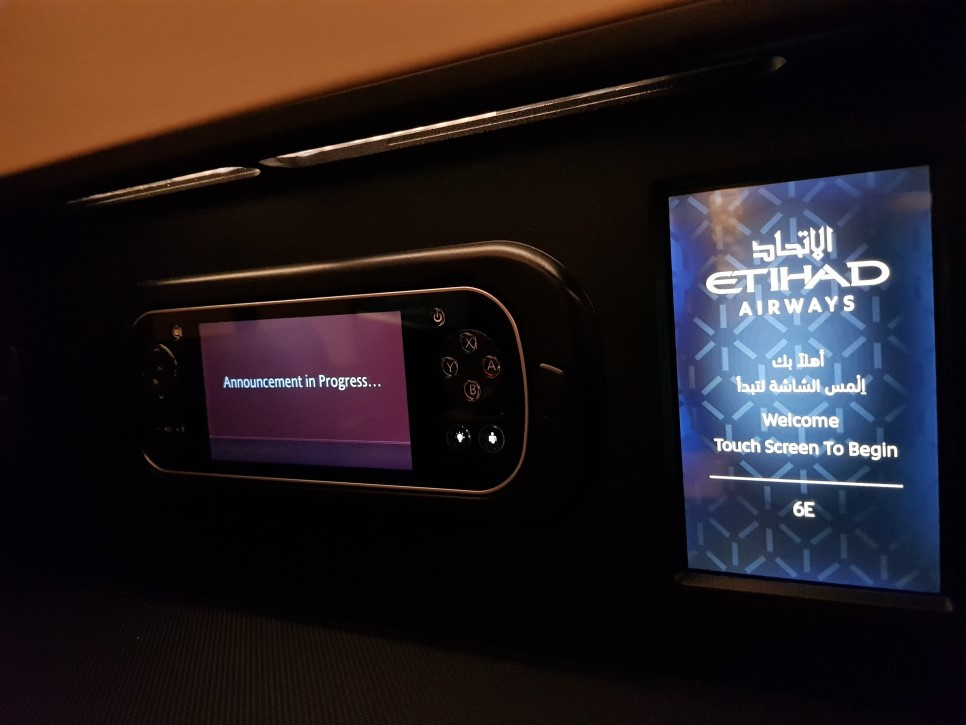 좌석 전면을 몽땅 차지하는 모니터는 18인치라서 화면이 시원시원한 느낌을 준다. 터치스크린이지만 유선 리모콘으로도 조작된다.