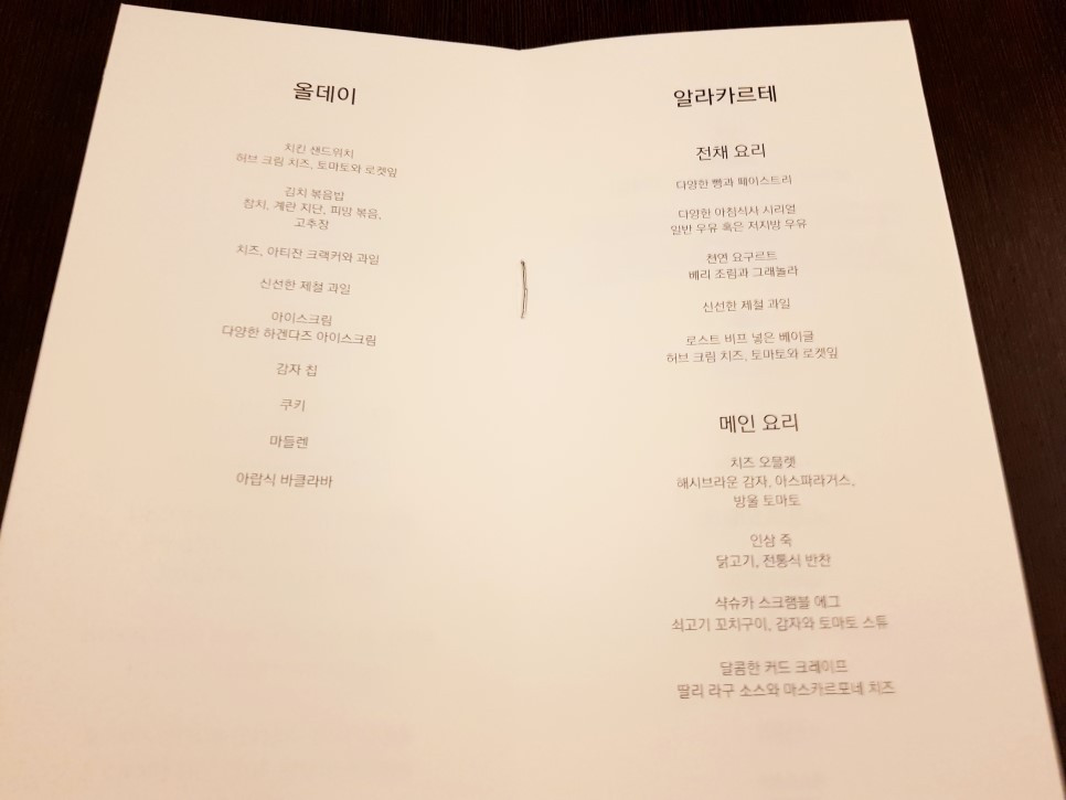 올데이 메뉴는 이/착륙 할 때만 제외하고 언제든 주문이 가능하고, 알라카르테는 전체요리, 메인, 후식 정도의 3코스 식이다.