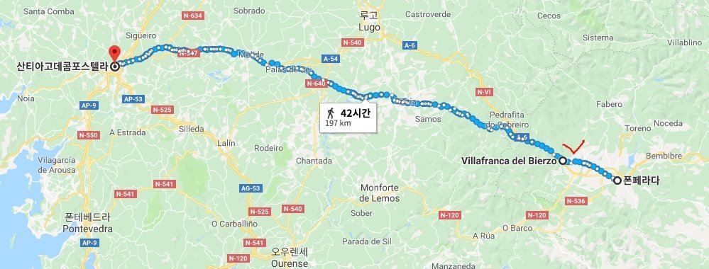 이 위치는 전구간 41일을 기준으로 보자면 약 30일째쯤 도착하는 마을이며, 폰페라다 출발을 기준으로 할 경우 도보 2일차에 해당되는 마을이다. (*마드리드에서 폰페라다까지 기차로 이동해서 순례길을 걸으면 약 12일코스가 된다.)