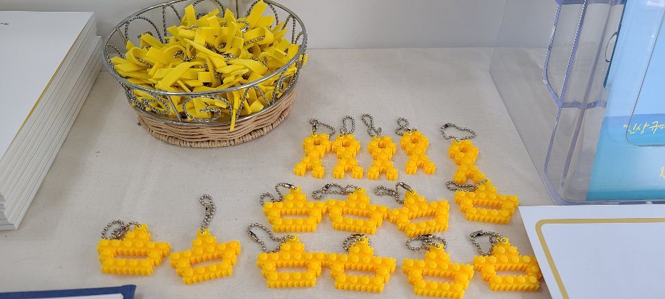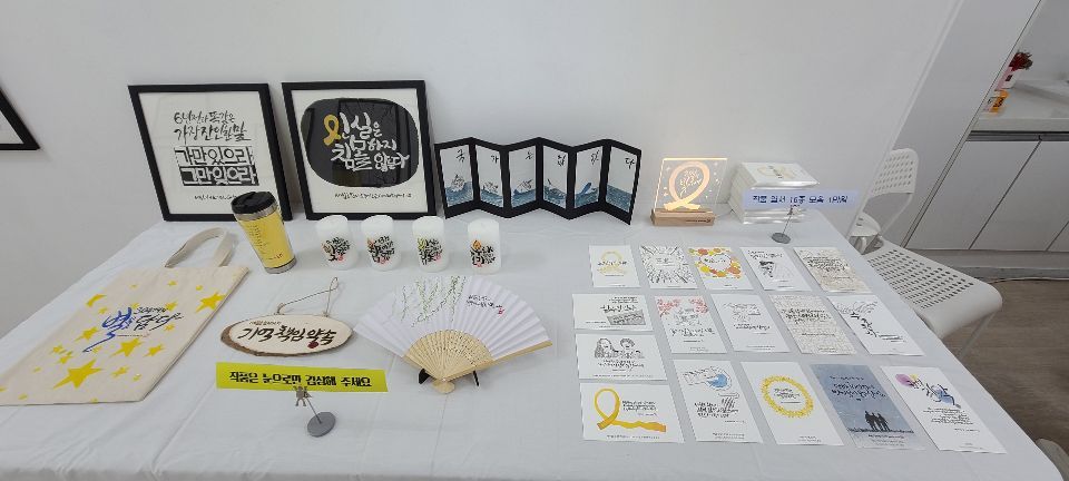무료 나눔으로 노란 리본과 배 모양의 고리가 준비되어있다. 그리고 작가님의 작품이 담긴 엽서 모음과 캘리 양초는 현장에서 구매할 수 있다.