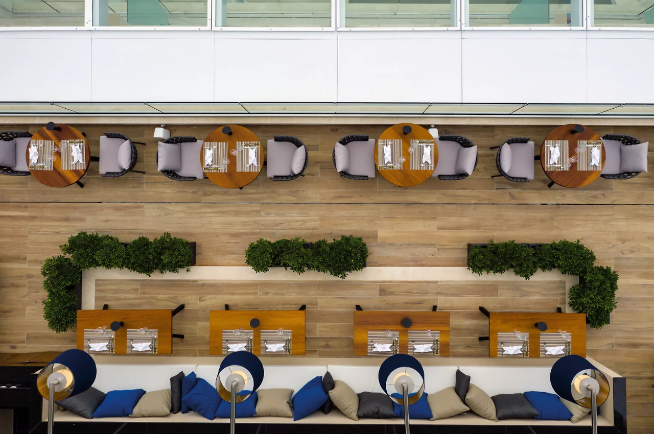 오픈 키친과 라이브 요리를 갖춘 하루 종일 식사가 가능한 레스토랑으로 세계 각국의 요리를 제공합니다. 실내 및 실외 좌석이 있습니다.