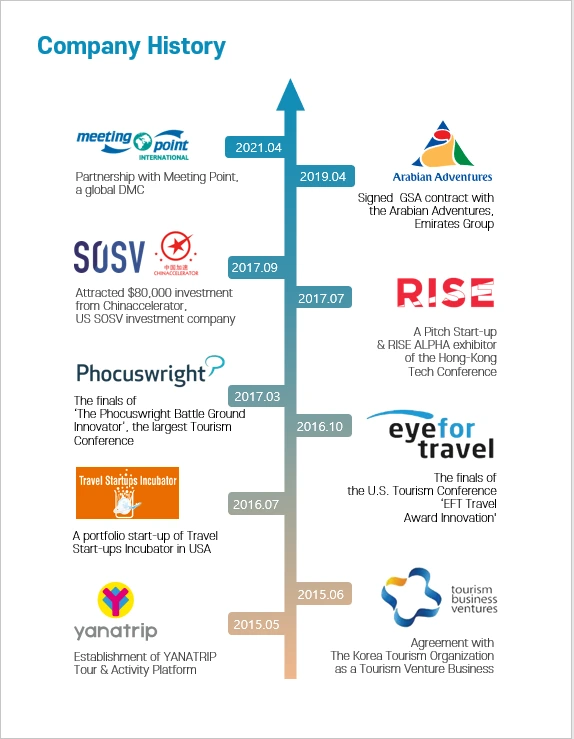 YANATRIP Co., Ltd. has maintained a strong network with reliable global tourism companies since its establishment in 2015. After its establishment, it was selected as a tourism venture company by the Korea Tourism Organization as a "tour and activity platform" and challenged the global startup market.
