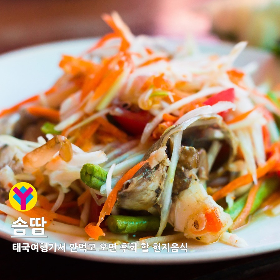 솜땀(som tam)은 설익은 파파야를 채 썰어 마른 새우, 고추, 땅콩가루 등과 같이 빻아 만든 샐러드로 동북부 지방 음식이다. 한국의 김치처럼 태국 음식 먹을 때 반찬처럼 시켜서 먹어도 좋다.