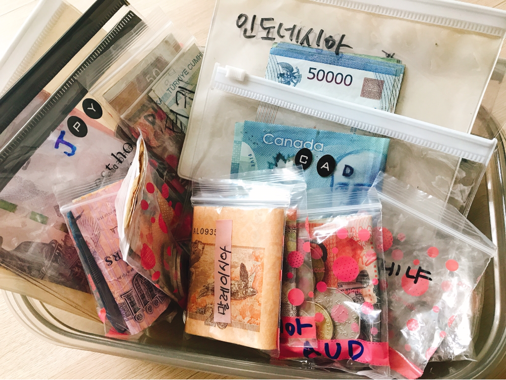 하지만 가끔 스케줄이 계속 나오지 않는 나라거나, 더 이상 취항하지 않는 나라가 되거나 했을 때 남은 돈은 애물단지처럼 쌓이게 된다. 그렇다고 해서 한국돈으로 다시 바꾸기에는 애매하고, 한국에서 취급하는 화폐가 아니라 유에스 달러로 환전한 뒤 한국 돈으로 다시 환전하면 너무 적은 돈이 된다. 그래서 언젠가 또 가겠지 하며 정리도 안한채 마구 모아놨더니, 우리 집에 놀러 온 친구가 나라 별로 분류해 정리해 주었다.