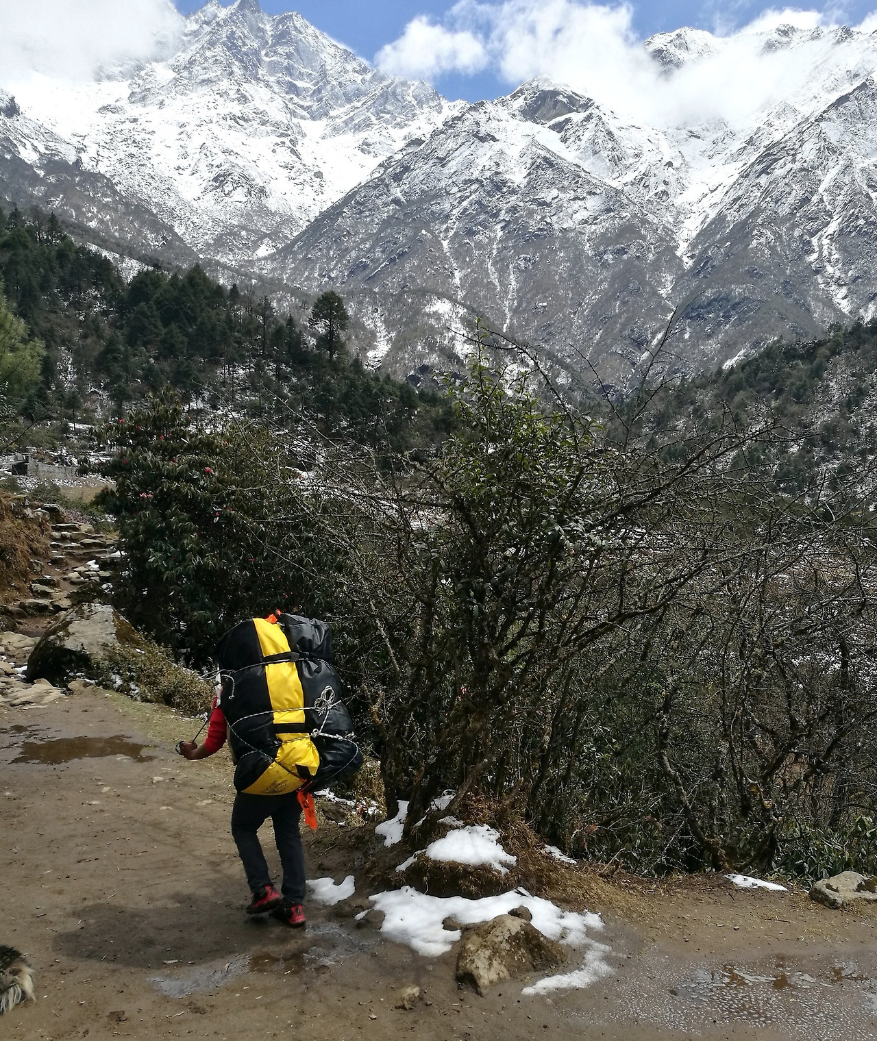 쉬고 있다 보면 포터들이 하나둘씩 지나간다. 무게를 쉽게 가늠할 수 없을 정도로 과한 부피의 짐을 허리에 이고 걸어간다. 짐과 묶여있는 밴드를 이마에 걸친 모양새가 허리와 목에 하중을 나누려는 것처럼 보였다. 가이드에게 물어보니 포터들은 하루에 20불가량을 받는다고 한다. 한동안 그들의 걸음을 바라보며 생각에 잠겼다. 저들에게 히말라야는 어떤 곳일까.