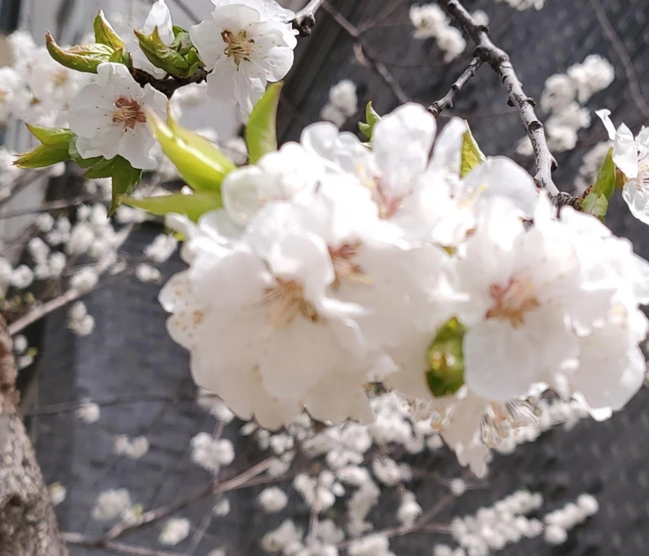 그들의 머리 위에는 가지가지마다 겹으로 핀 매화꽃이 풍성하고, 발아래 화단 언저리에는 노란 민들레 꽃이