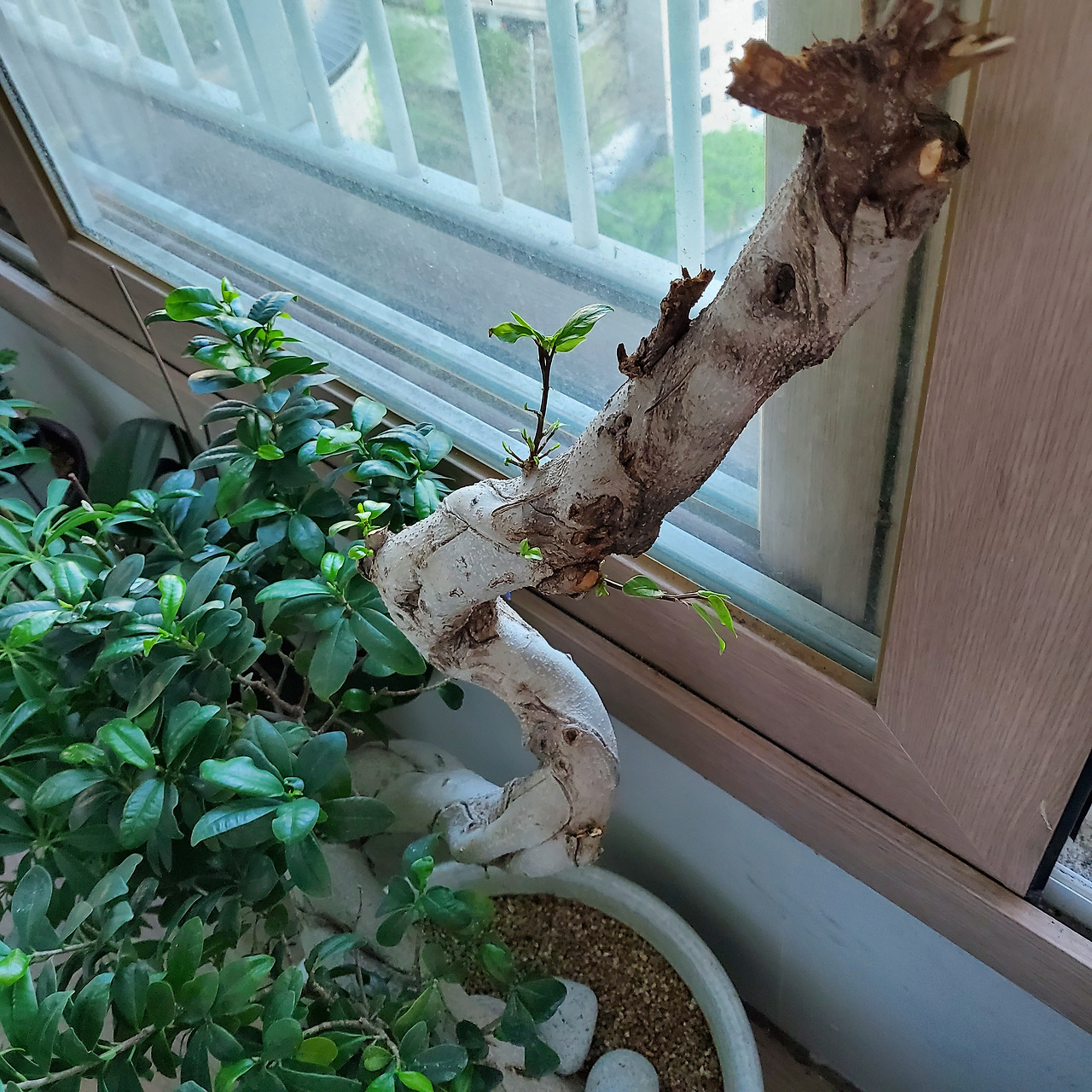 그런 그 녀석이 언 부분을 과감히 외과적 수술을 한 아내 덕인지, 잘린 바로 밑 부분과 또 옆 부분에서 얼마 전에 파란 신록이 올라왔다. 햐~ 고 놈 참 예쁘네 하고 수없이 반복하고 또 반복했다. 고맙다 요 녀석아.