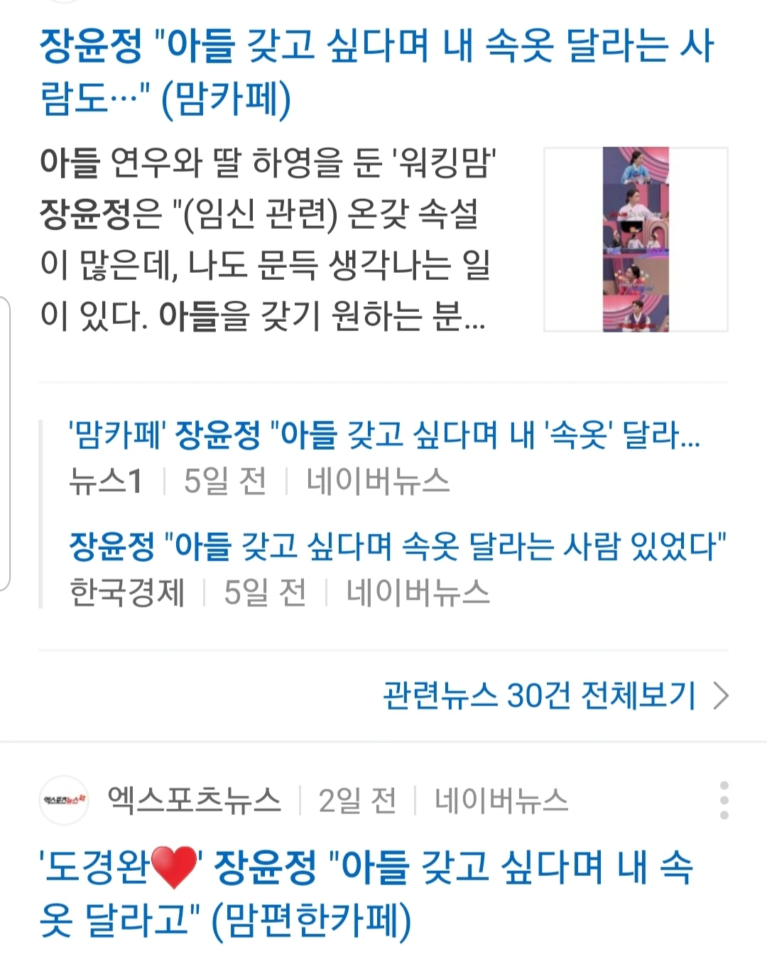 가수 장윤정한테 속옷을 달라고 할 정도로 아들 낳고 싶었던 엄마는 몇 살쯤일까? 그녀에게는 무슨 일이 있었던 것일까? 딸은 이미 있어서 아들을 가져보고 싶었을까? 아니면 아직도 아들 손주 아니면 거들떠보지 않는 시댁 어른이 있는 것일까?
