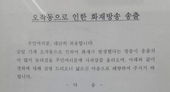 나:(다급히) 아저씨 불났나요?? 경비아저씨:(심드렁) 오보입니다.. 기계 오작동입니다. 불 안 났어요.